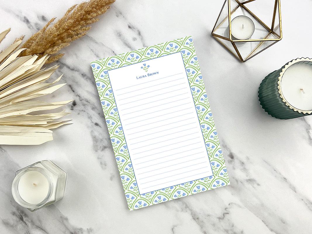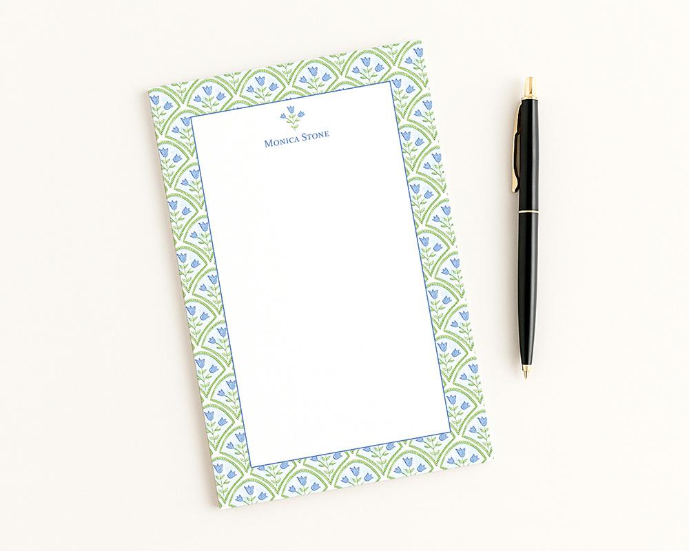 Add some color and charm to memos, notes, and to do lists with this charming notepad! This notepad features a border of blue and green watercolor scallops with tiny clusters of flowers. Personalized at the top with your name and available with or without lines.