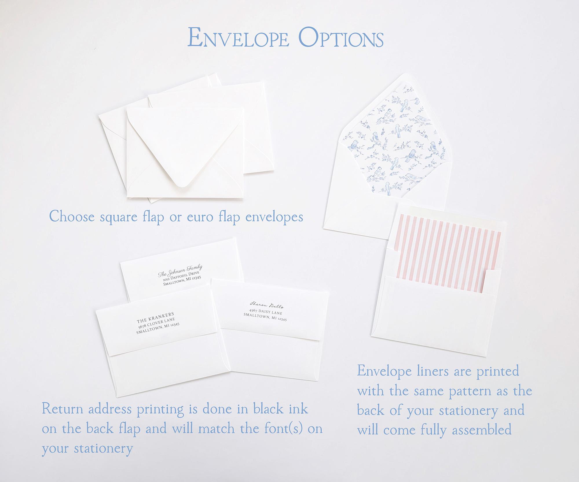 - If you add envelope liners, the pattern on the liners will match the back of the stationery cards. Envelopes and liners will come assembled for you.