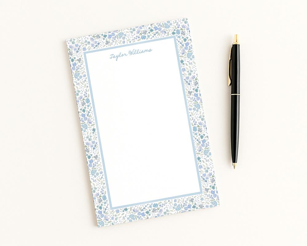 Make notes and to do lists a little more fun with this darling floral notepad! This notepad features a border of tiny blue watercolor flowers. Personalized at the top with your name in a charming script font and available with or without lines.