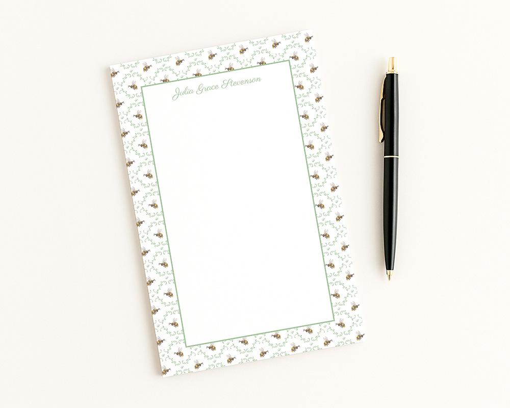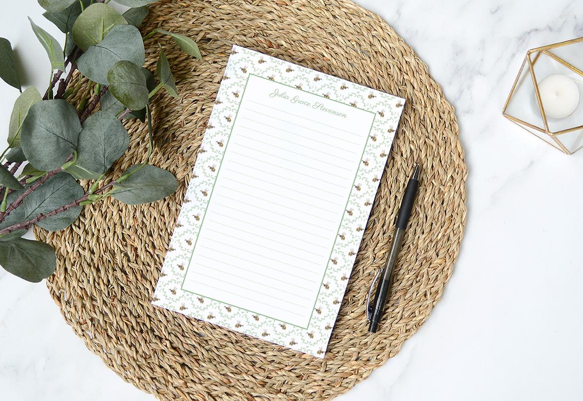 Make notes and to do lists a little more fun with this darling notepad! This notepad features a border with a pattern of tiny green leaves and watercolor bumblebees. Personalized at the top with your name or custom message in a charming script font and available with or without lines.