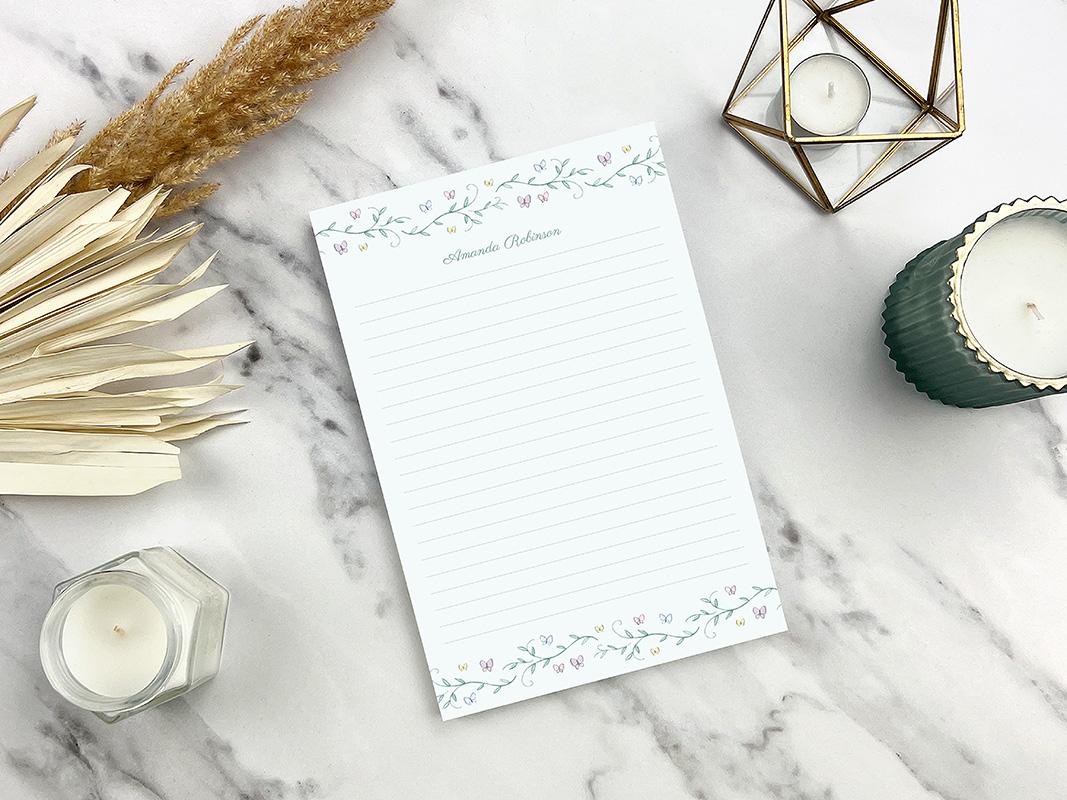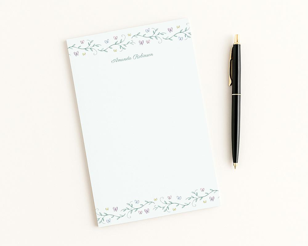 Make notes and to do lists a little more fun with this darling notepad! This notepad features watercolor vines and tiny pastel butterflies along the top and bottom. Personalized at the top with your name or custom message in a charming script font and available with or without lines.