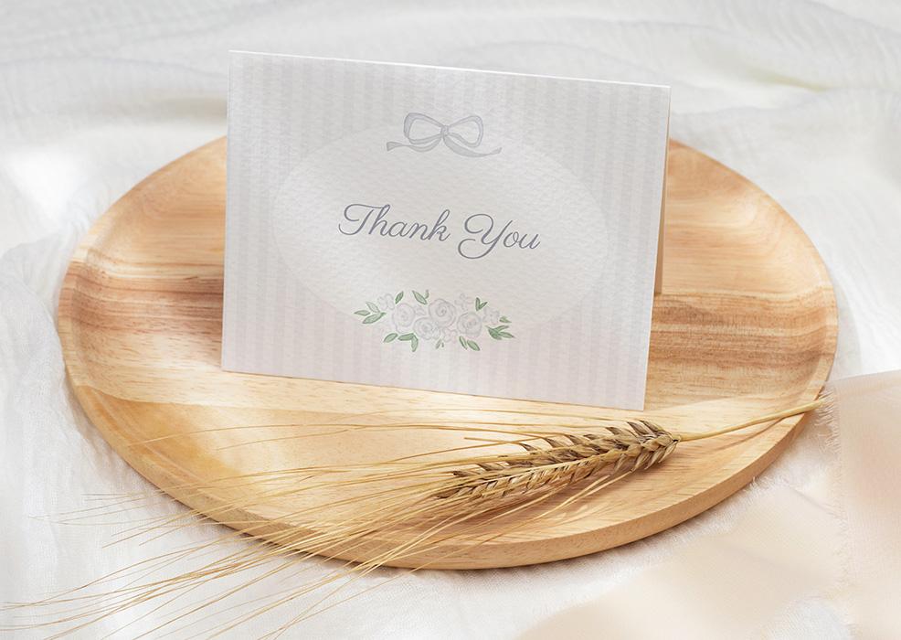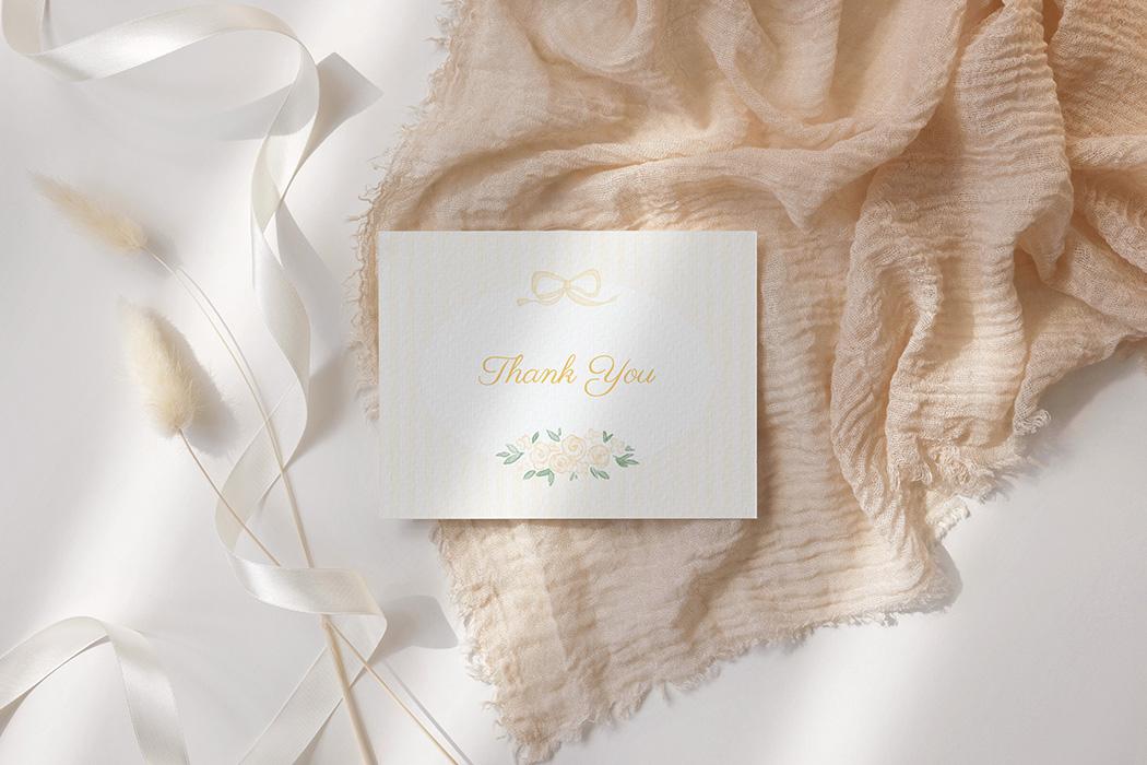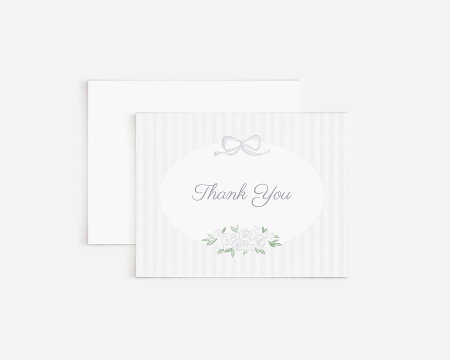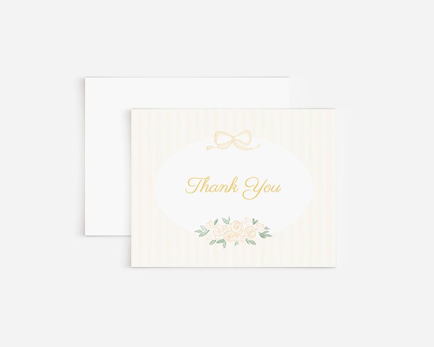 These thank you cards in soft, muted, neutral colors with tiny watercolor bows, roses, and subtle striped backgrounds are charming for weddings and wedding related events. Available in soft “silver” gray or pale yellow “gold.”