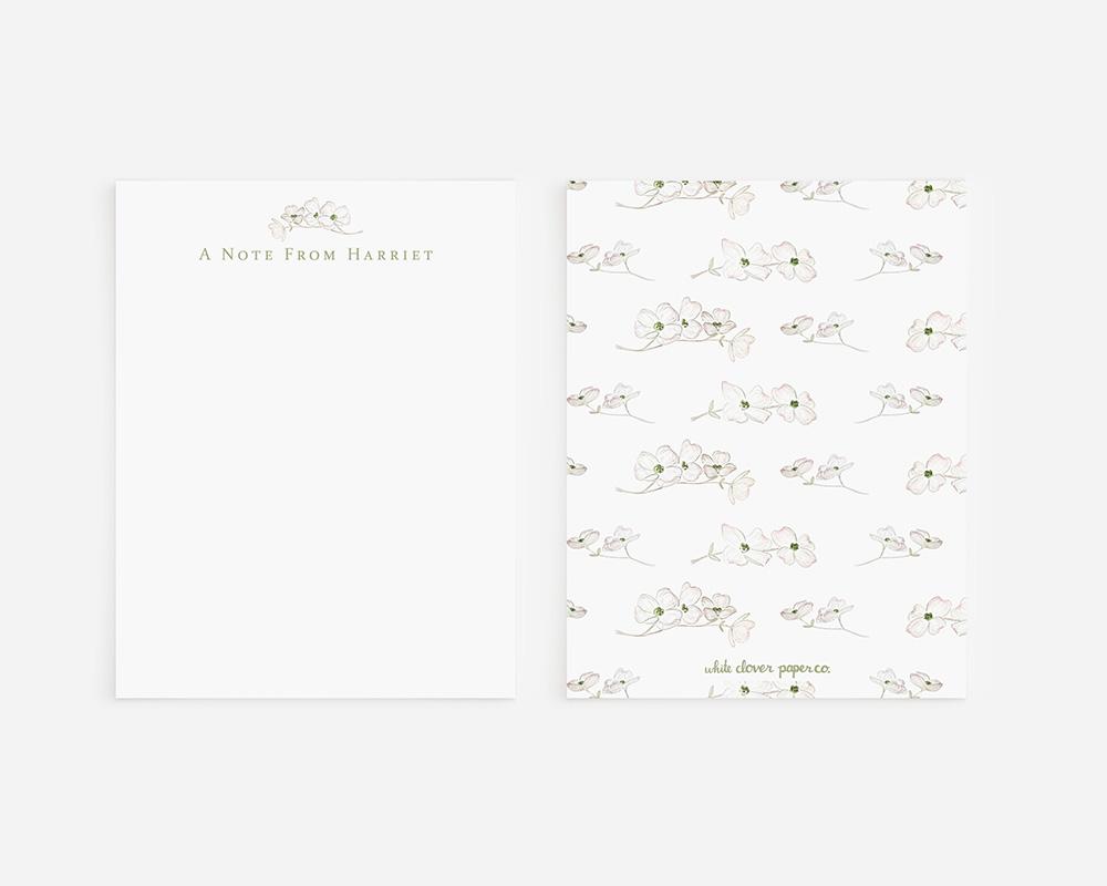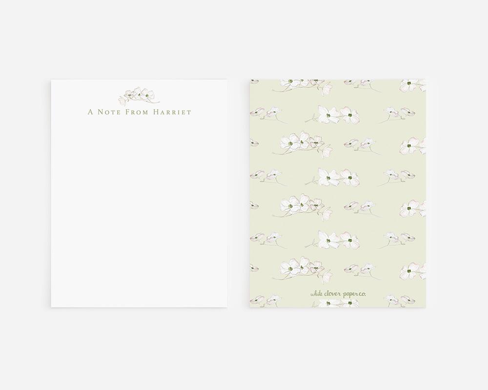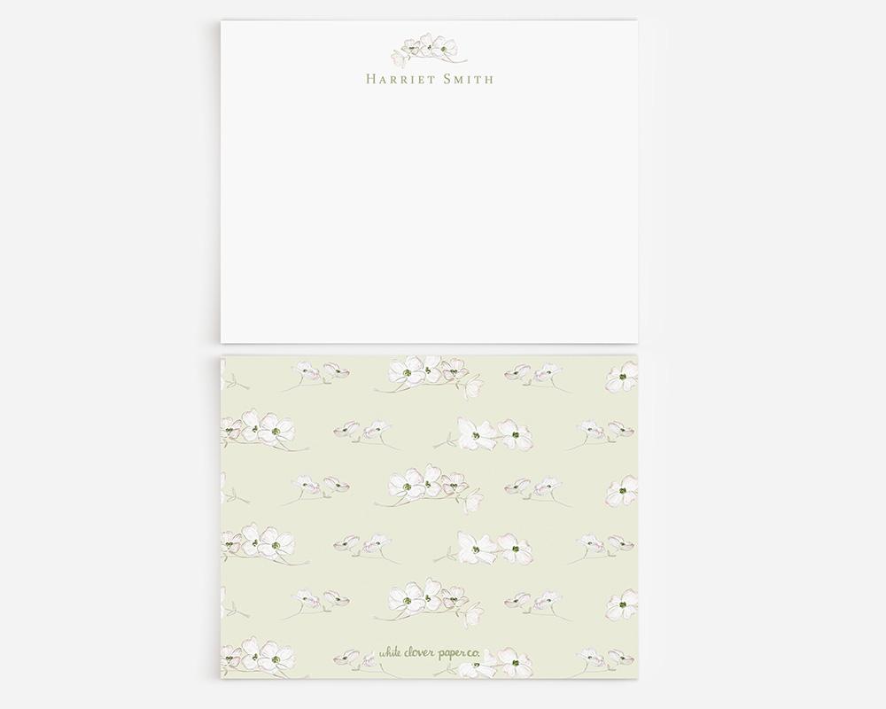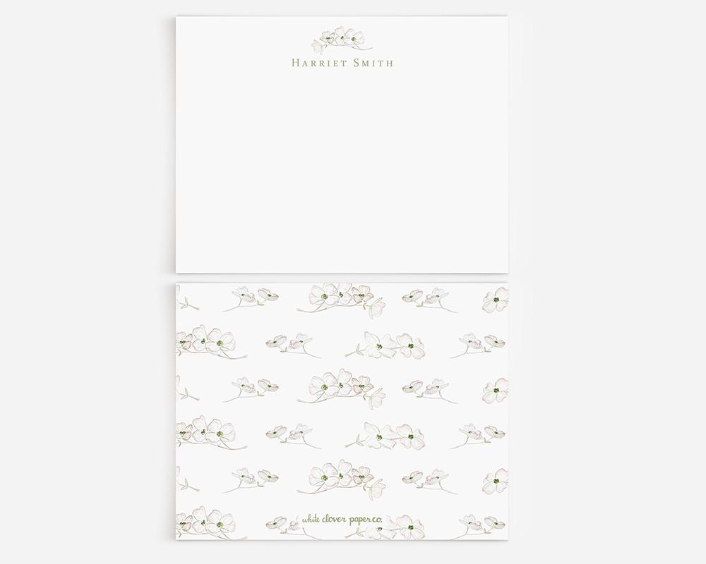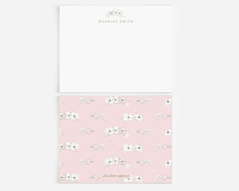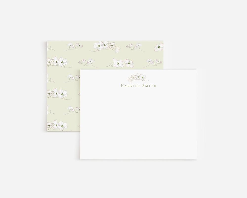 A charming and elegant stationery set to elevate your notes and letters. The front of each card features your personalization at the top along with a delicate watercolor branch of dogwood flowers. The back of each card features a pattern of tiny watercolor dogwood flowers on a background of green, pink, or white.