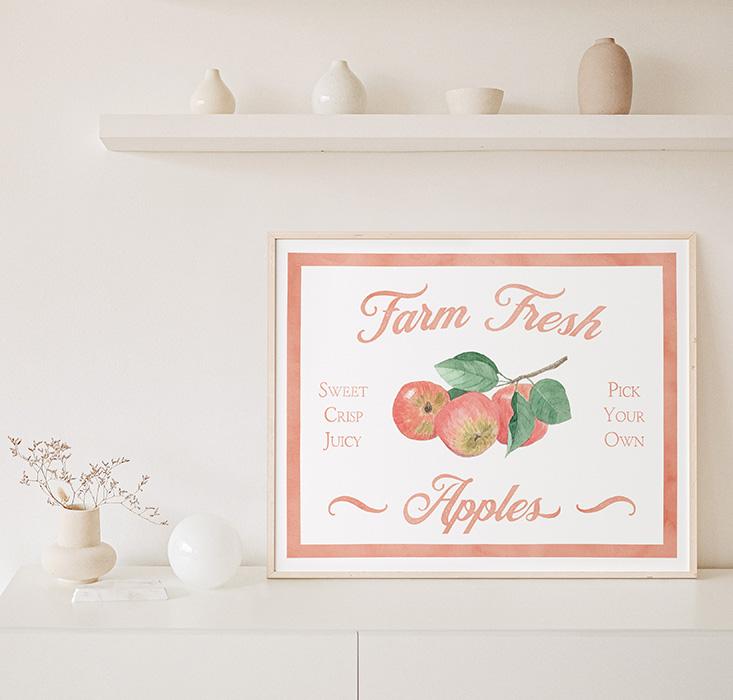 A watercolor art print in the style of  vintage fruit farm signs, featuring a bunch of red apples and reading “farm fresh apples; sweet, crisp, juicy, pick your own.” Bordered with a thick watercolor stripe and available in a variety of colors. Makes a great addition to your rustic or farm house décor, especially in the kitchen.