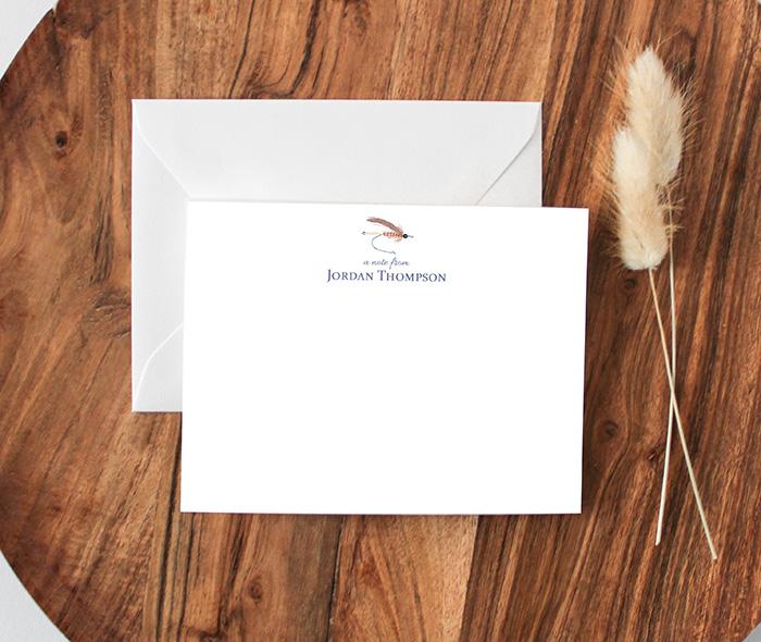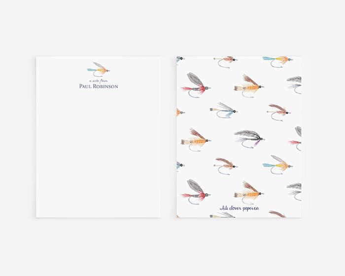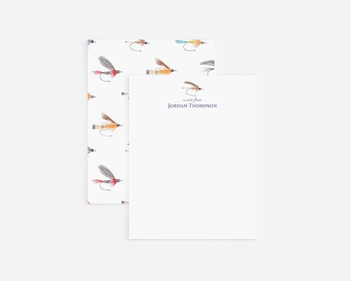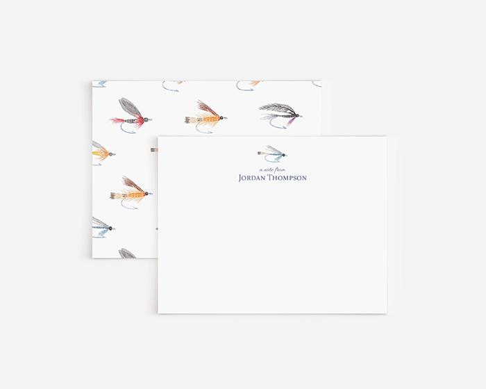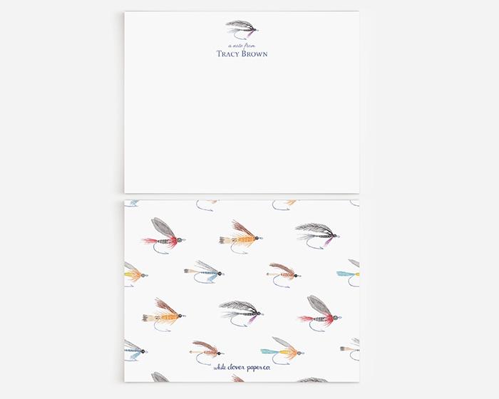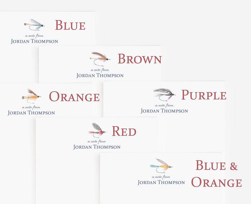 For the fishing enthusiast, these stationery cards add some personality and fun to letters, thank you notes, and other correspondence. The front of each card features your personalization and choice of fishing lure color. The back of each card features a pattern of tiny watercolor fishing flies in a variety of colors.