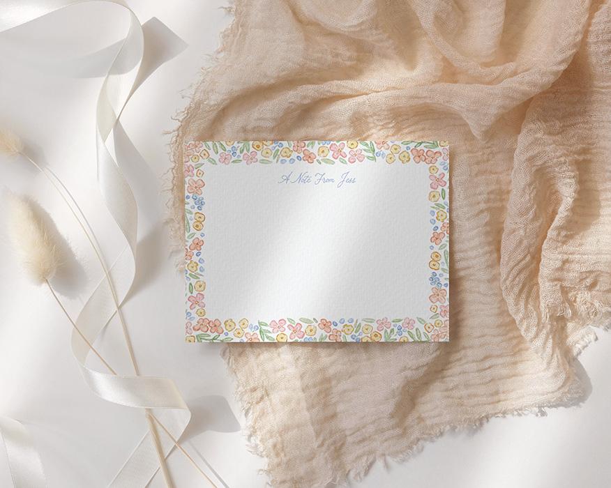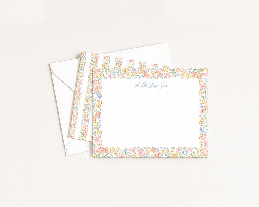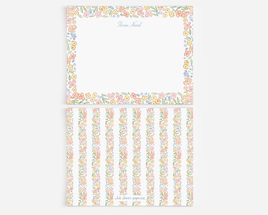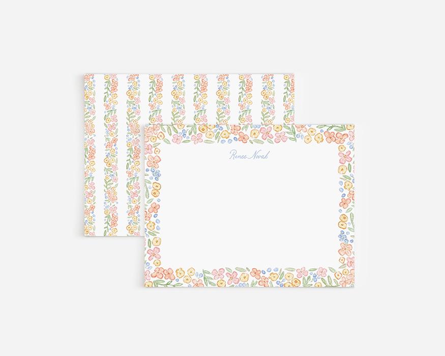 A sweet and charming stationery set perfect for all your notes and letters. The front of each card features a border of tiny watercolor flowers in shades of pastel peaches, pinks, yellows, and blues, along with your personalization in a charming script font. The back of each card features a pattern of watercolor stripes made up of tiny watercolor flowers.