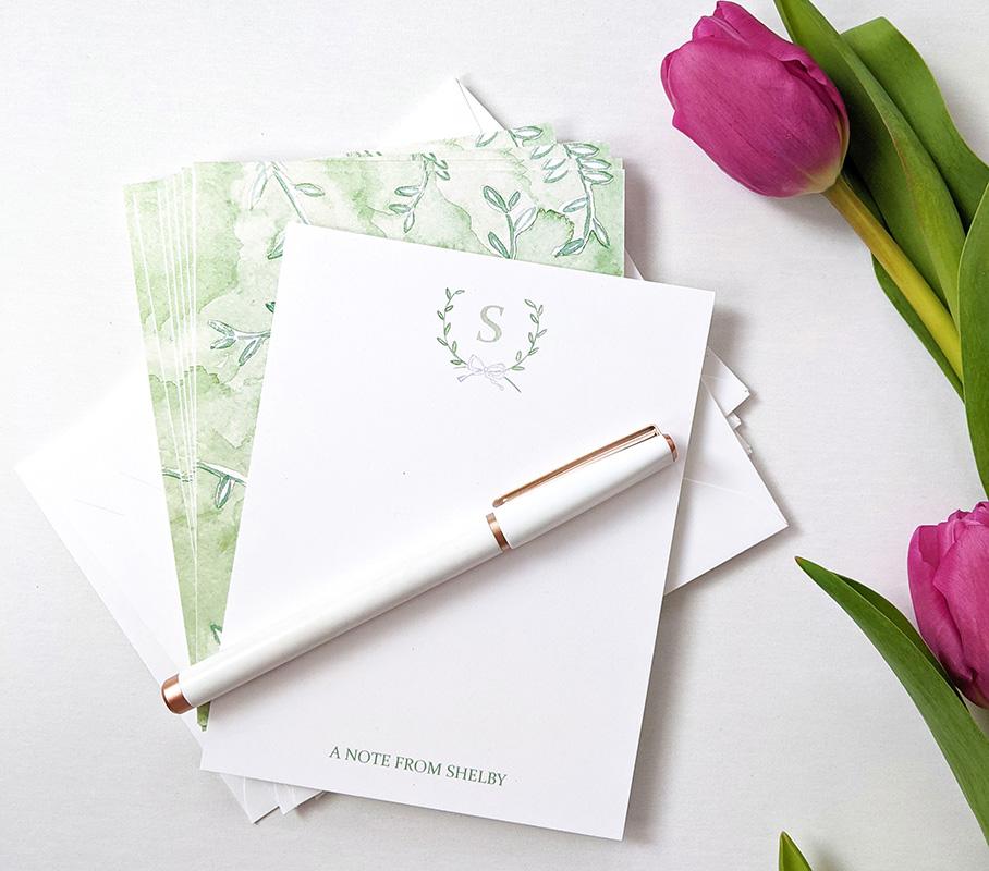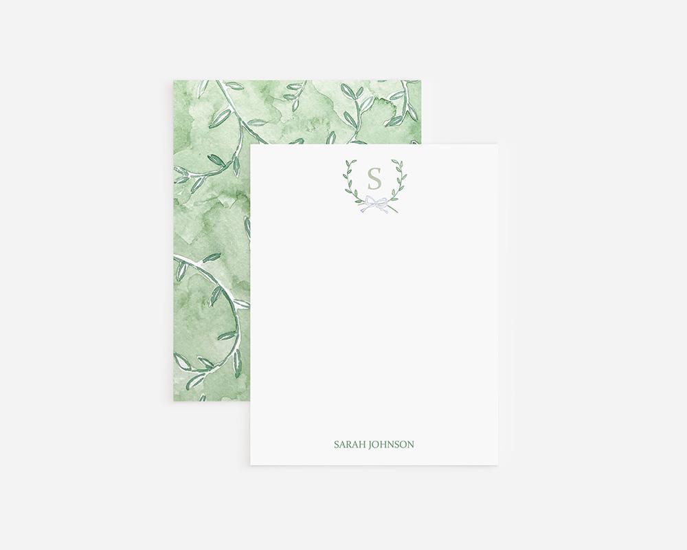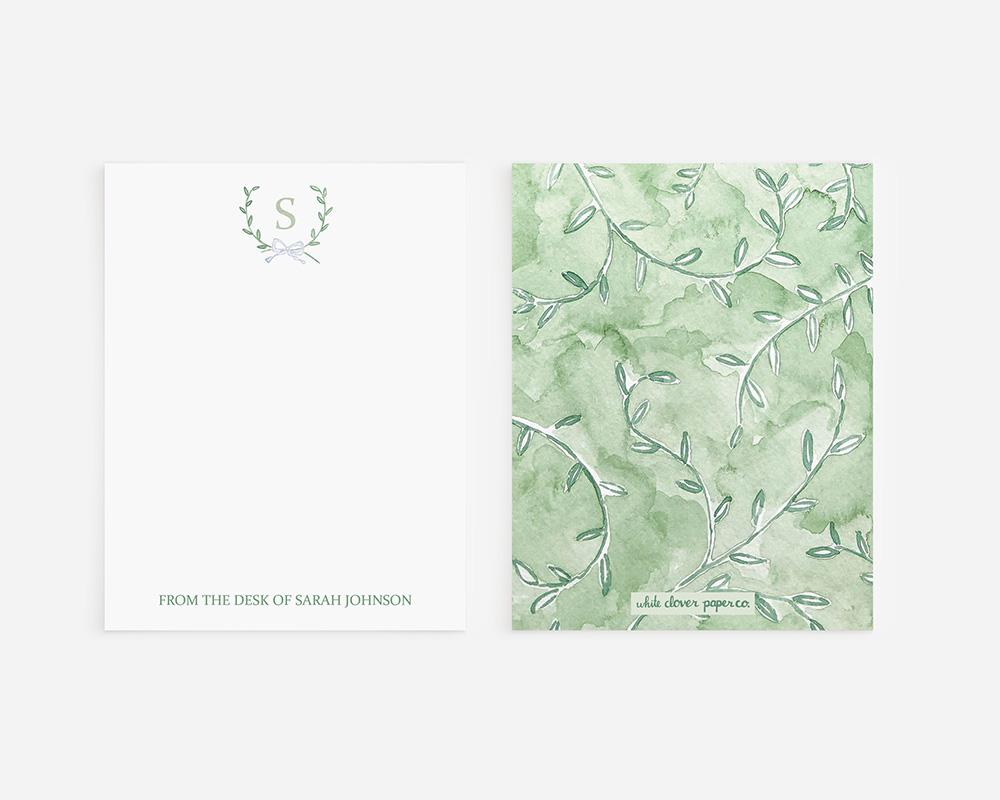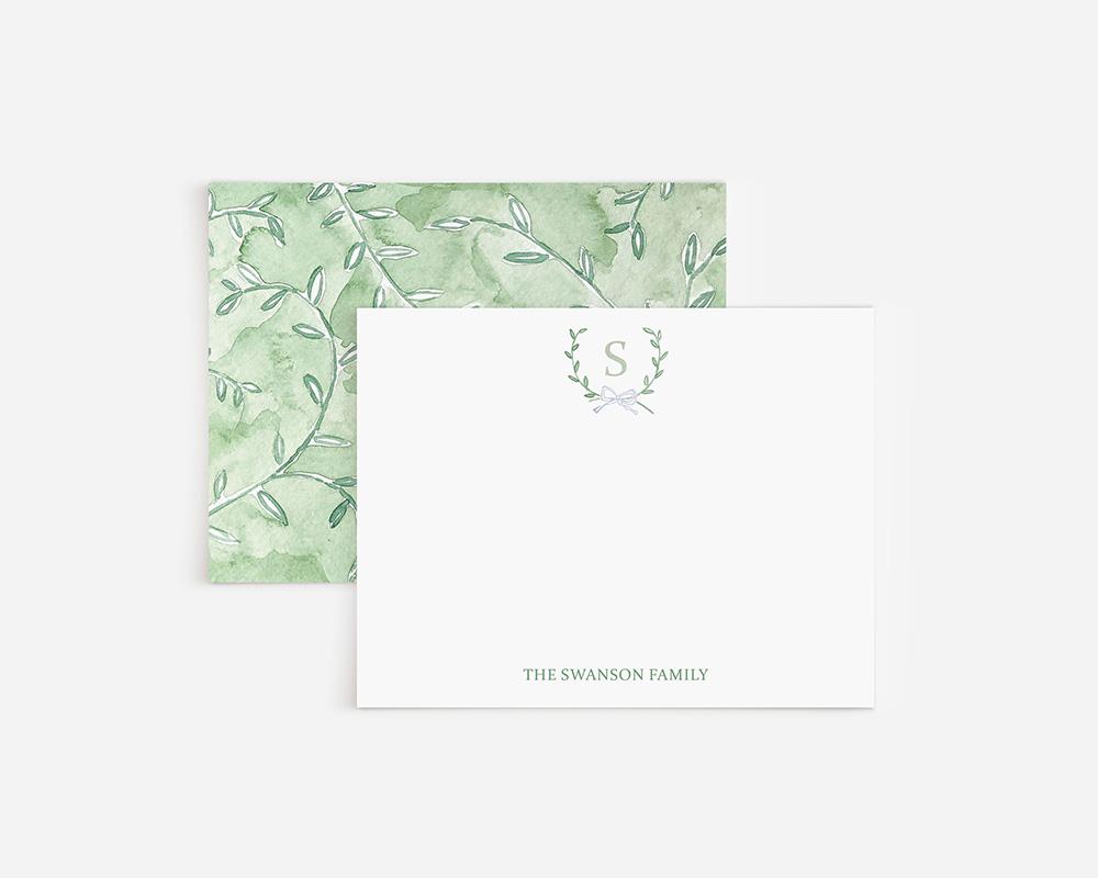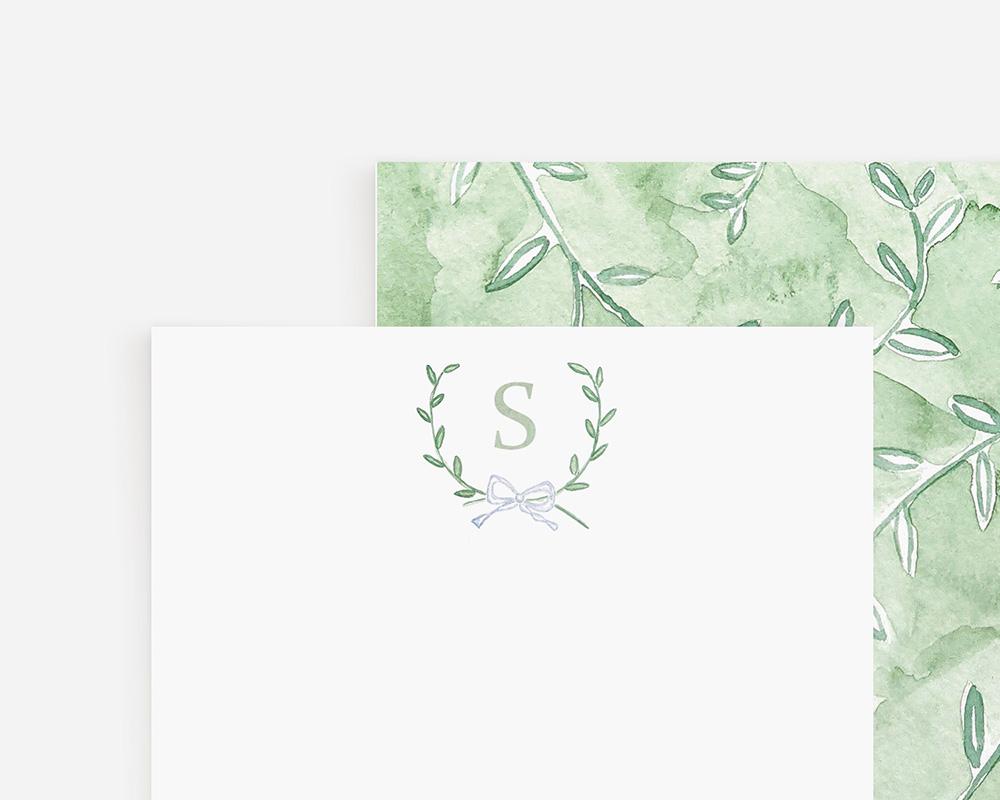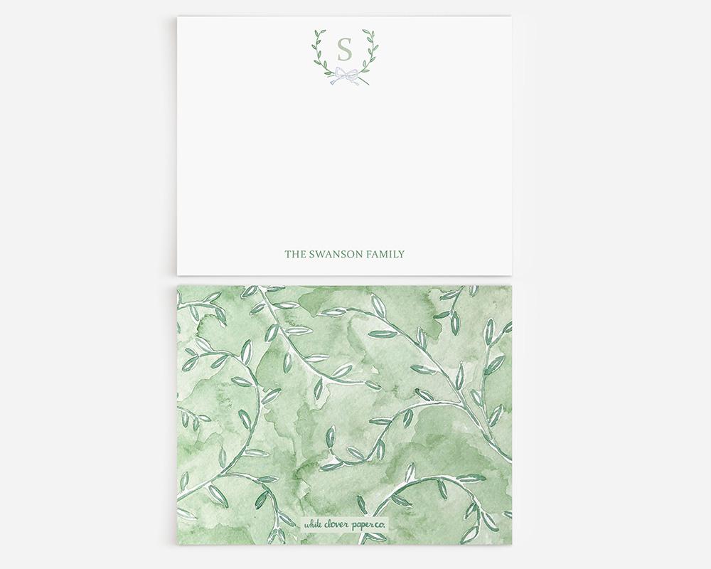 A sweet and charming stationery set that’s perfect for couples, new babies, or simply adding a darling touch to notes and letters. The top of each card features a monogrammed crest of tiny green watercolor leaves and a bow with your personalization at the bottom. The back of each card has a watercolor design of green leafy vines.