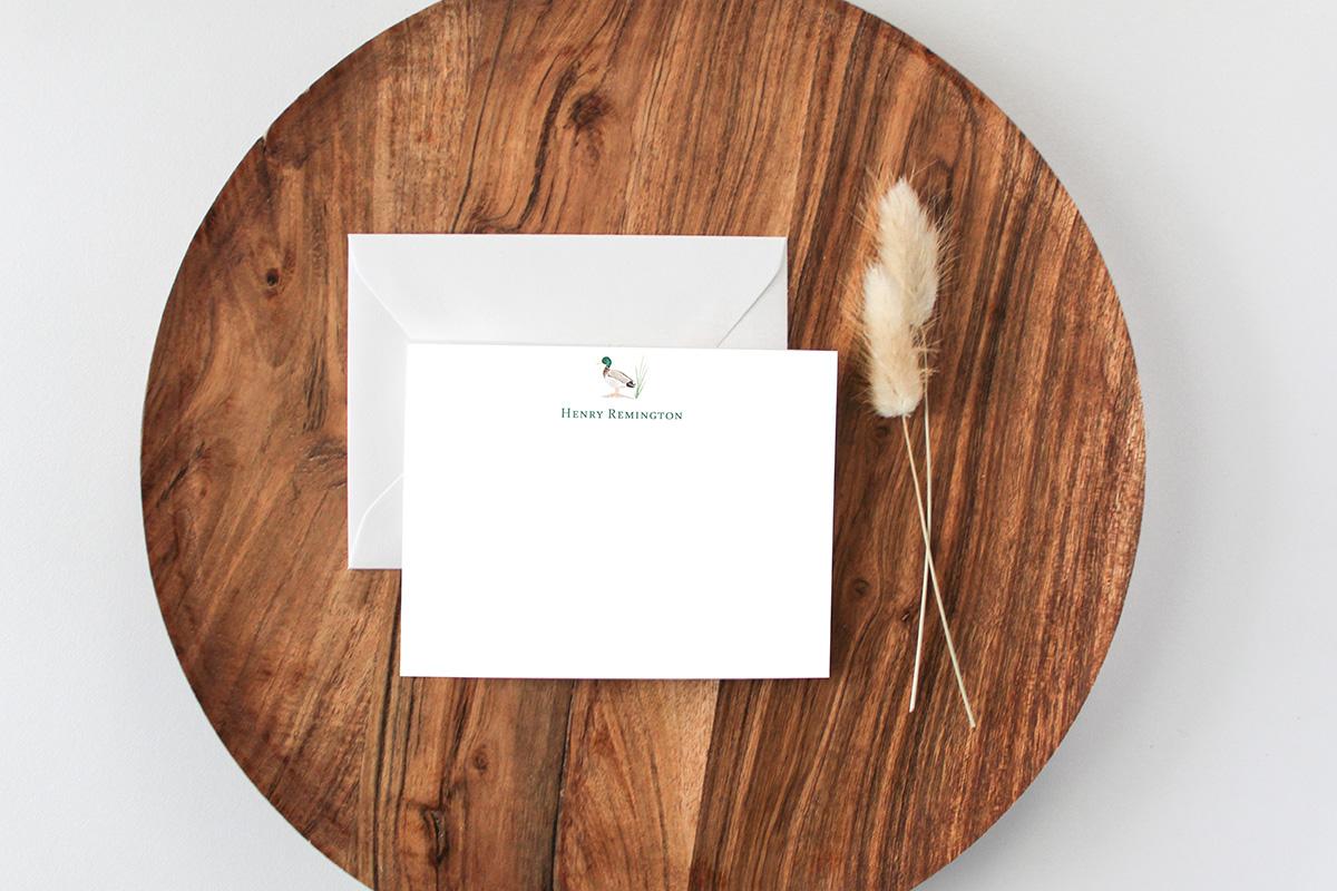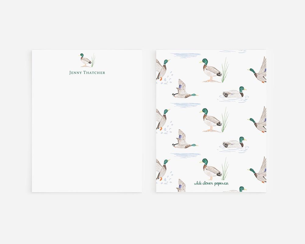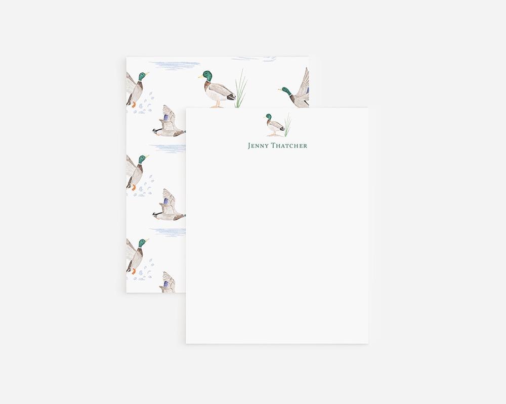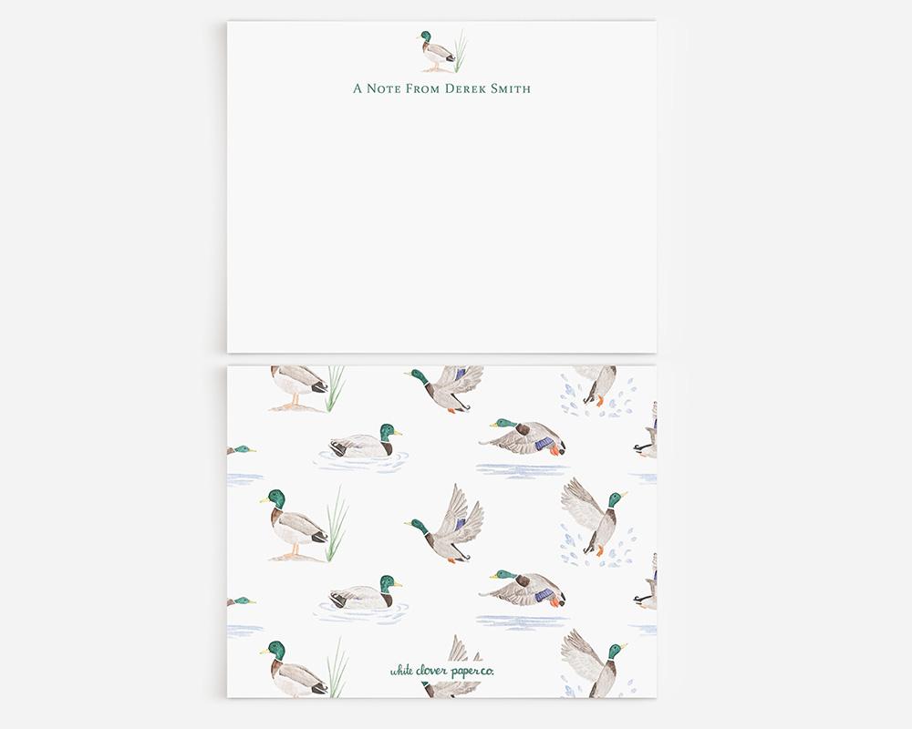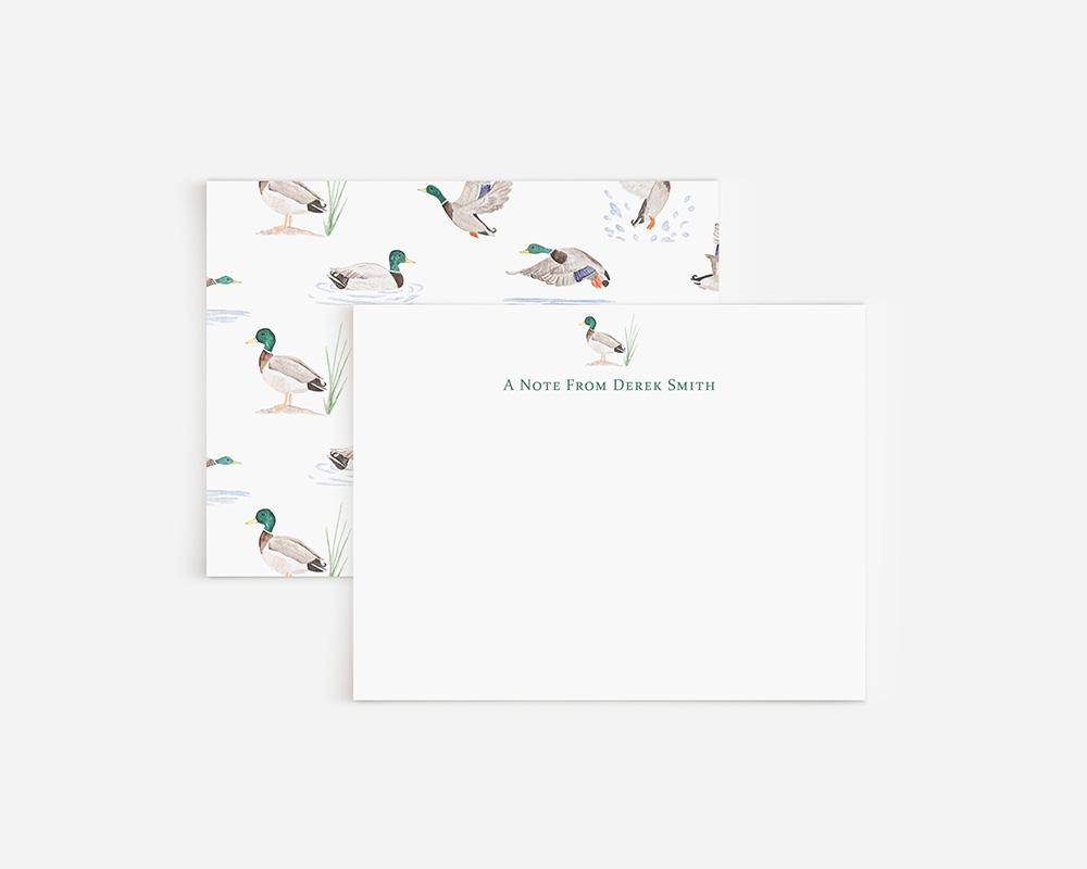 Perfect for those who love birds and the outdoors! This stationery set features a tiny watercolor mallard duck along with your personalization of the front of each card, and a pattern of watercolor mallard ducks in the water and in flight on the back.