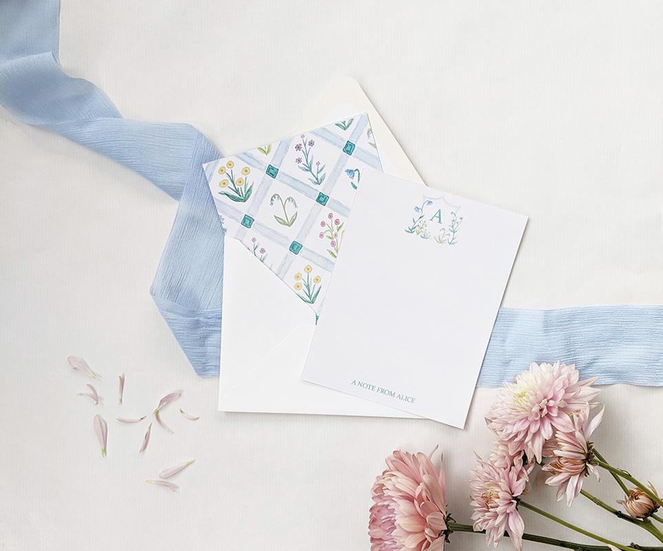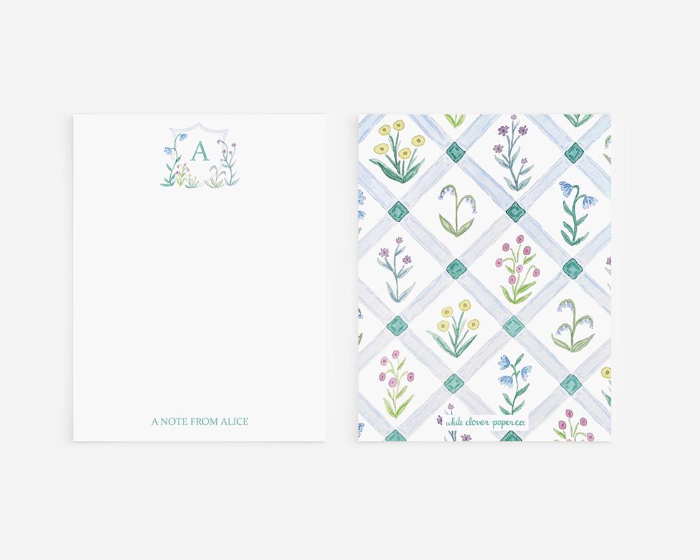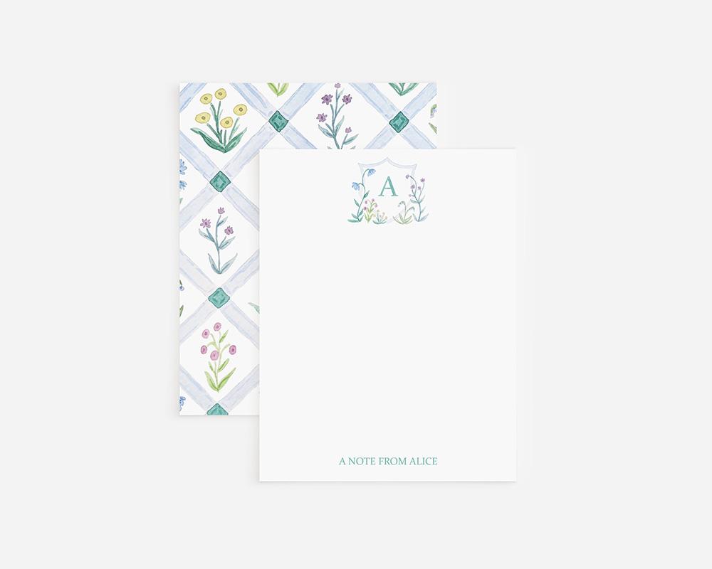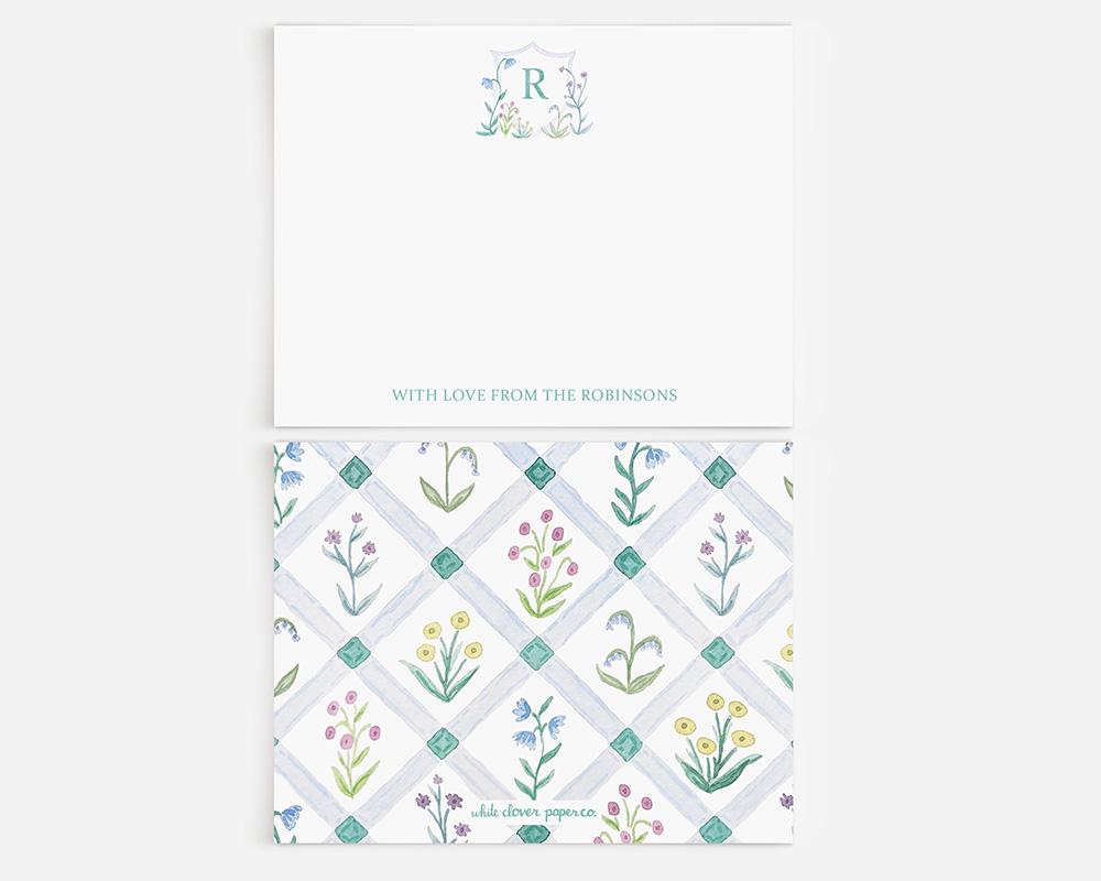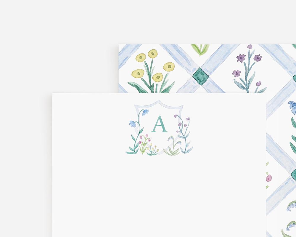 This charming stationery set is perfect for couples or for adding a touch of sophistication to your notes. The front of each card features a monogrammed crest with tiny blue and purple watercolor flowers at the top and your personalization at the bottom. The back of each card features a watercolor lattice pattern with blue and purple flowers.