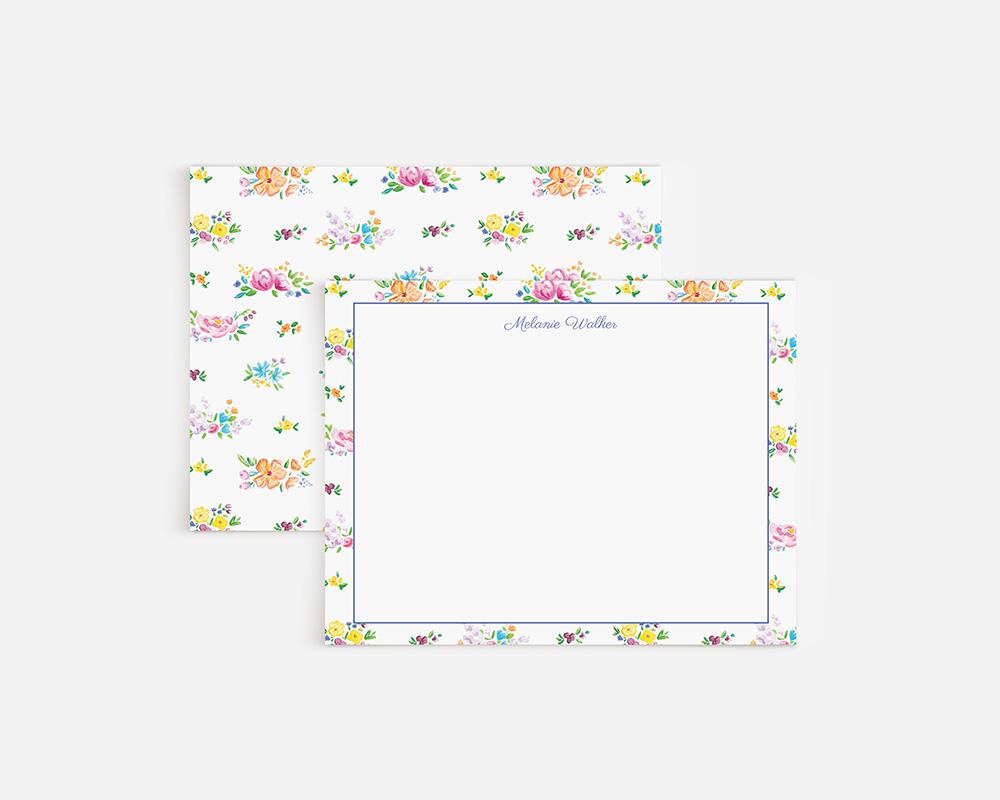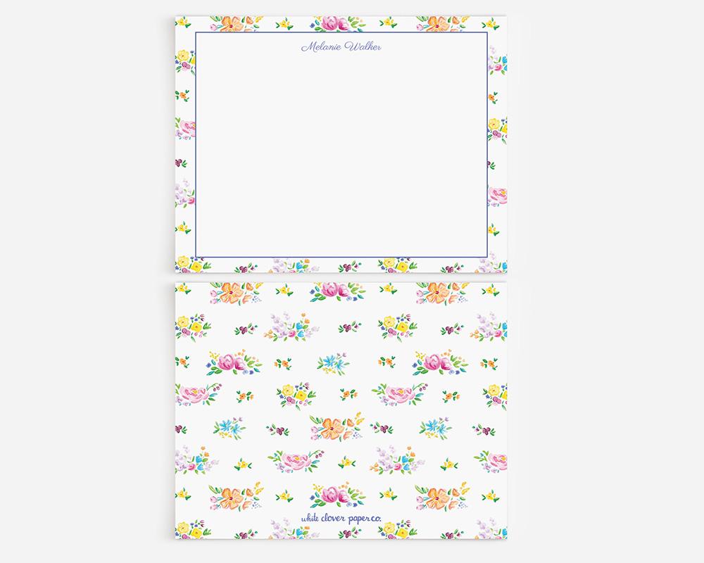 A charming stationery set that’s sure to brighten your day! The front of each card features a border with tiny clusters of watercolor flowers in fun and vibrant colors along with your personalization in a pretty script font. The back of each card features a pattern of tiny multicolored flowers.