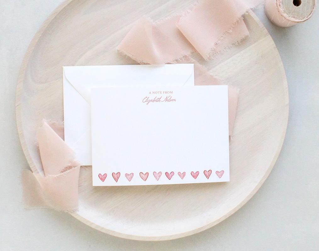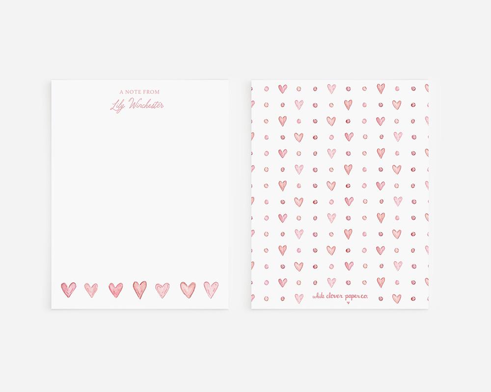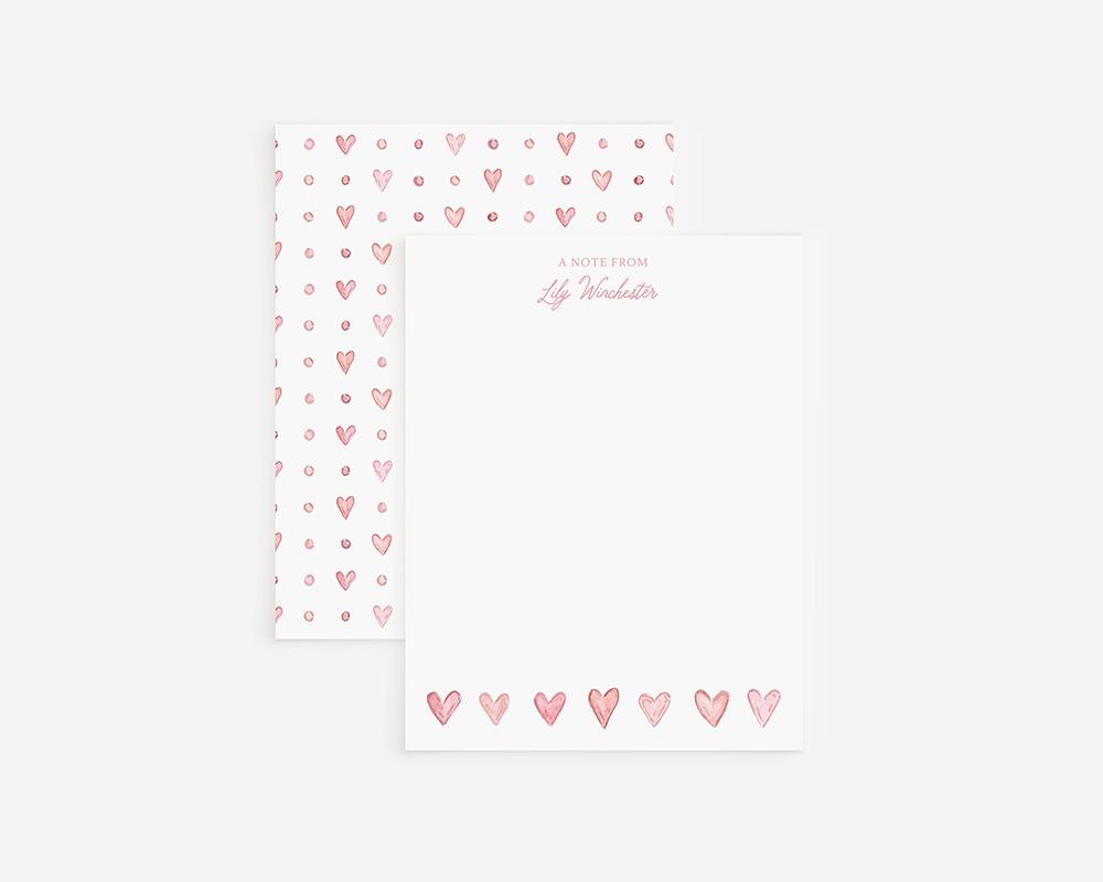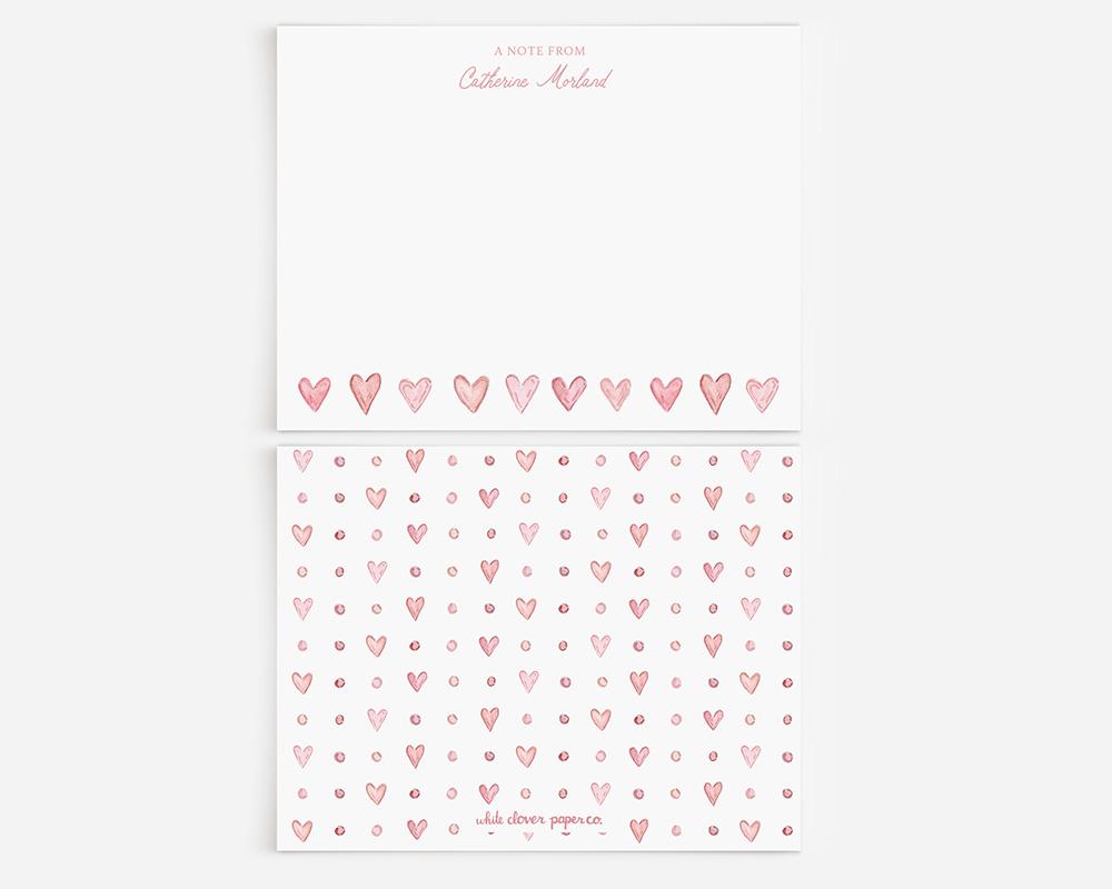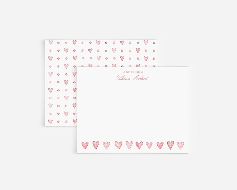 A charming stationery set with tiny pink watercolor hearts. The front of each card features your personalization at the top along with a row of tiny pink watercolor hearts along the bottom. The back of each card features a pattern of tiny hearts and dots.