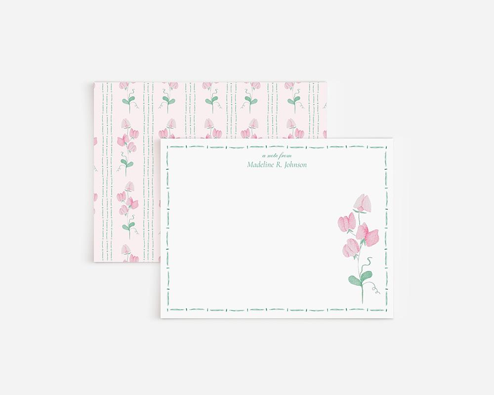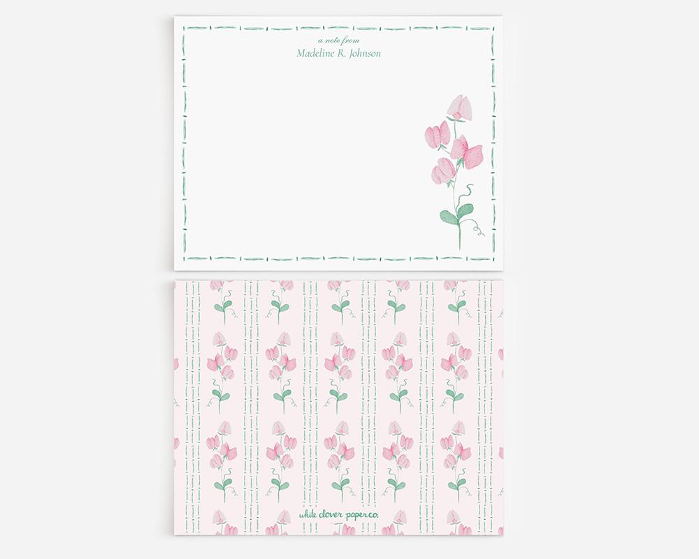 These darling stationery cards are sure to charm and delight! The front of each card has a border of thin green watercolor lines along with your personalization at the top and a cluster of pink watercolor sweet pea flowers in the lower right corner. The back of each card features a pattern of sweet pea flowers and green stripes on a pale pink background.