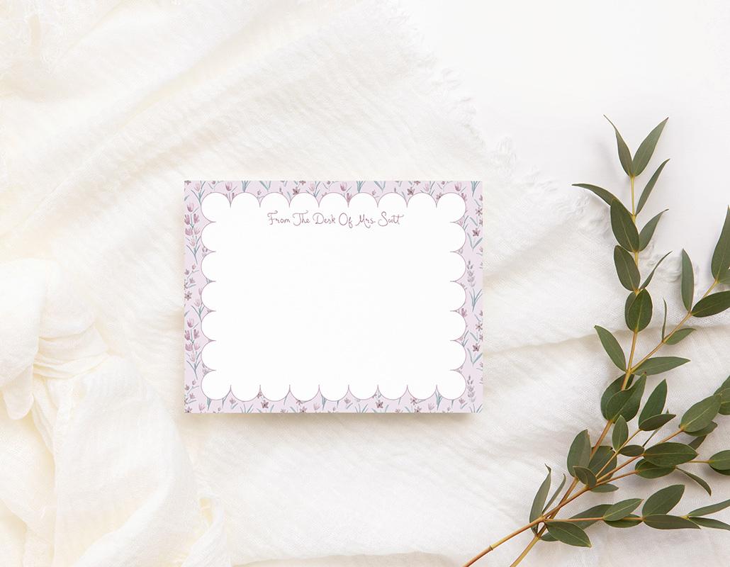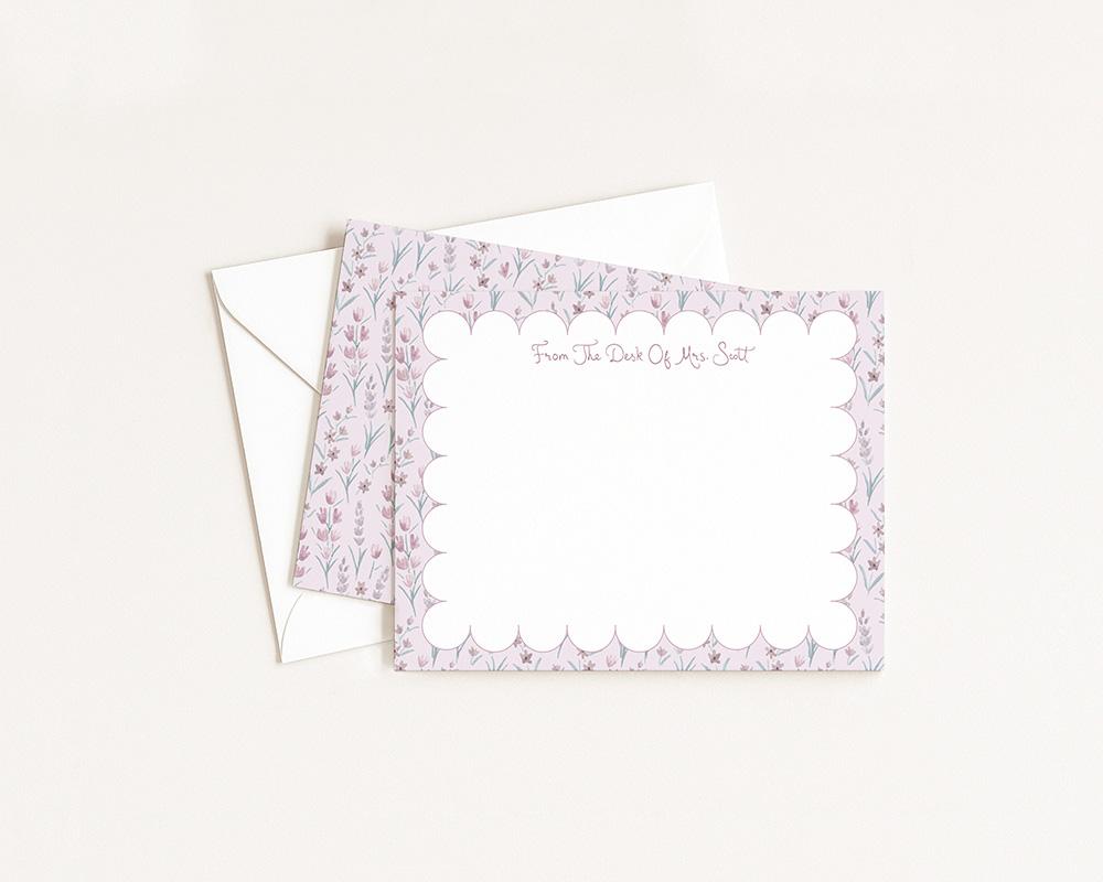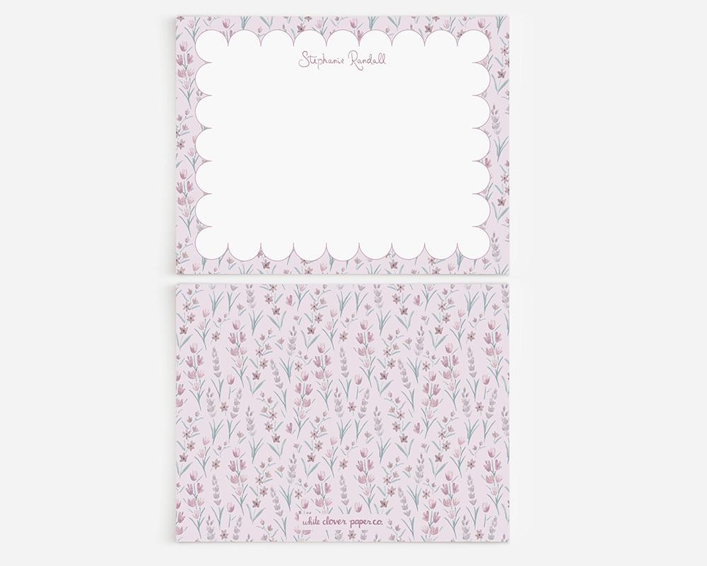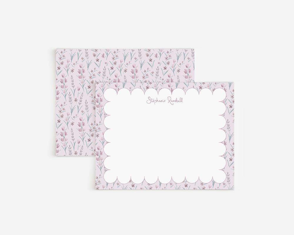 A sweet and cheerful stationery set that’s sure to brighten your day! The front of each card features a scalloped border with tiny purple watercolor flowers along with your personalization in a whimsical script font. The back of each card features a pattern of tiny purple flowers on a light purple background.