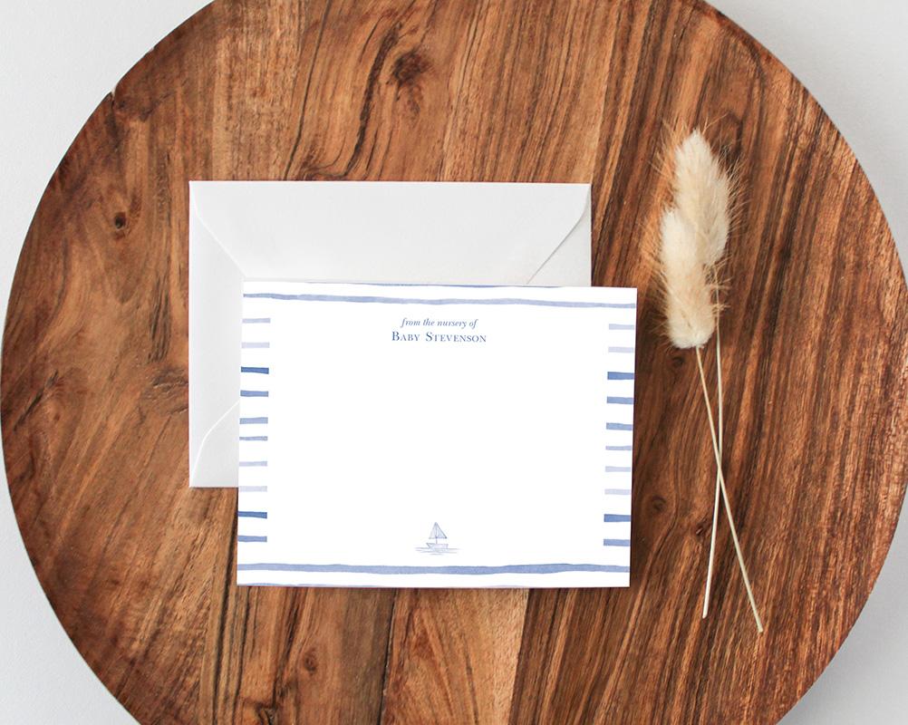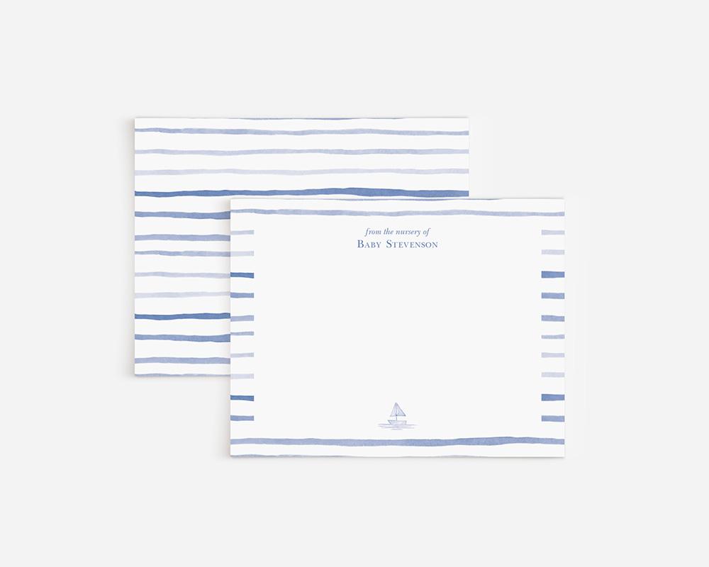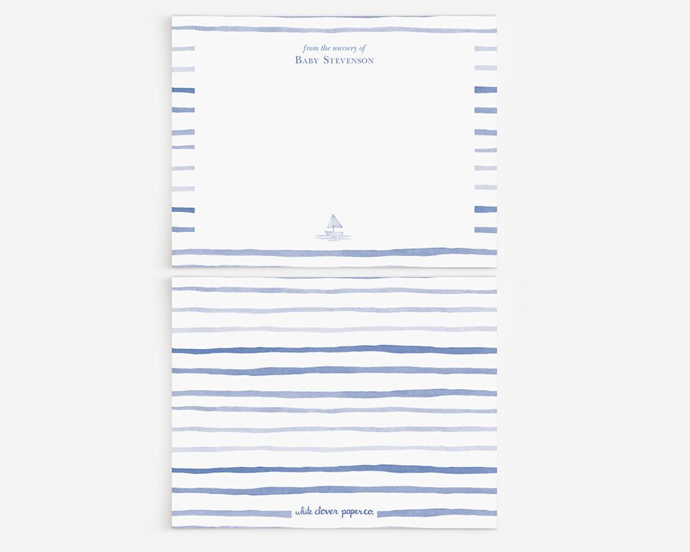 A sweet set of stationery perfect for baby showers and nurseries with a nautical or sailboat theme! The front of each card has a border of thin blue watercolor stripes and baby’s personalization at the top along with a tiny sailboat at the bottom. The back of each card has a pattern of thin blue watercolor stripes.