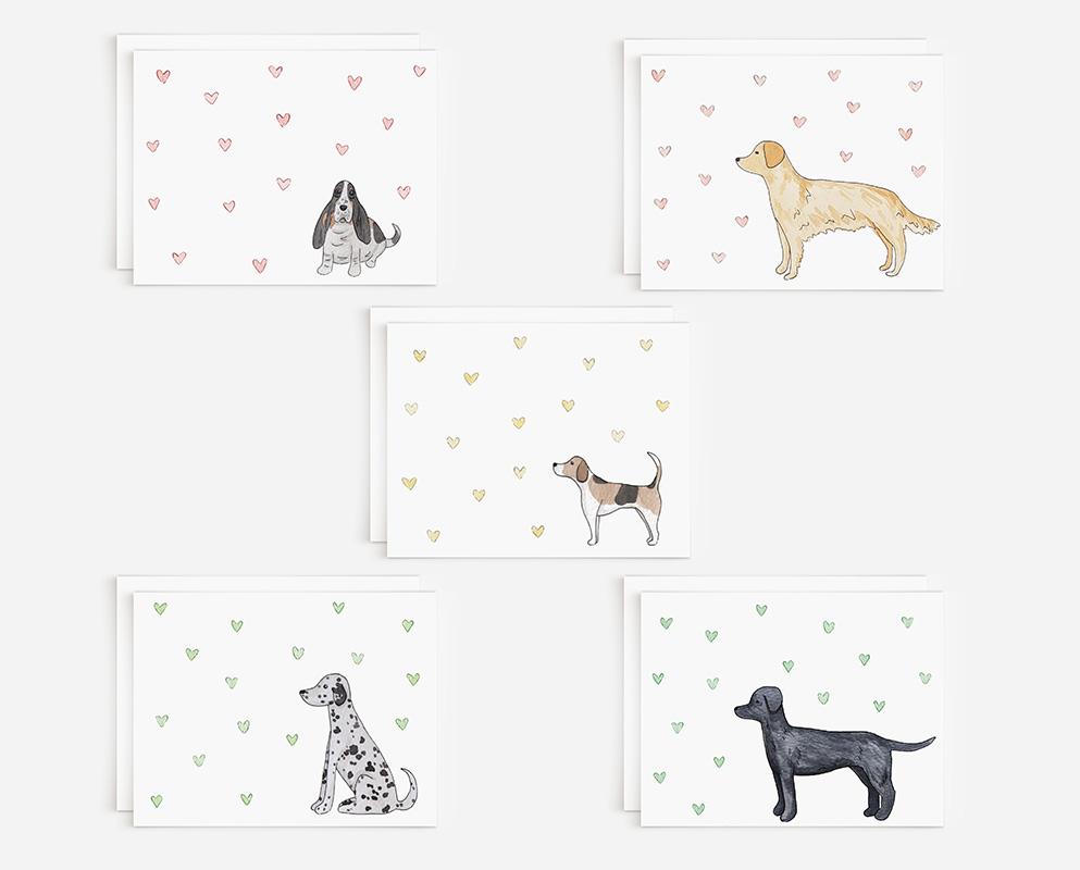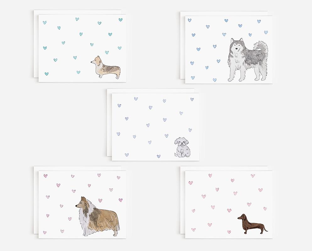 A set of everyday greeting cards perfect for dog lovers! Each card in this variety pack of eight features a different watercolor dog surrounded by tiny hearts in a unique color. Dogs included in this set are a beagle, corgi, dachshund, Dalmatian, golden retriever, Maltese, Siberian husky, basset hound, black lab, and sheltie. All cards are blank inside, making them perfect for any occasion and for all your notes and letters.