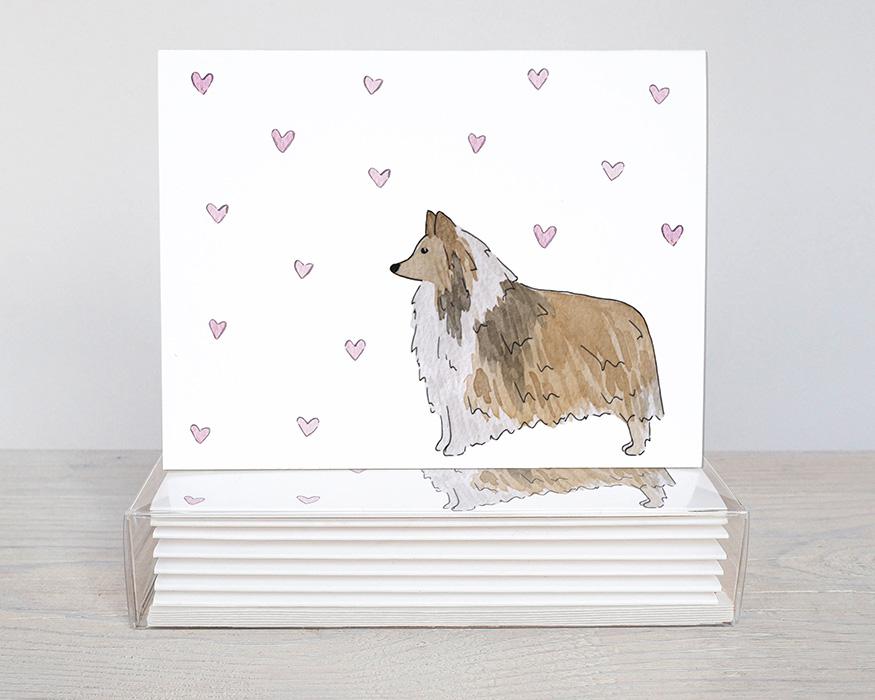 An all occasions greeting card for sheltie owners and lovers! This watercolor greeting card features a Shetland sheep dog surrounded by tiny purple hearts. Card is blank inside, making it perfect for all your notes and letters.
