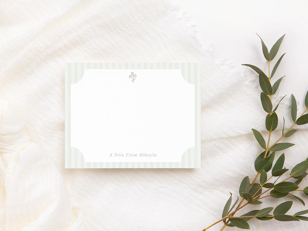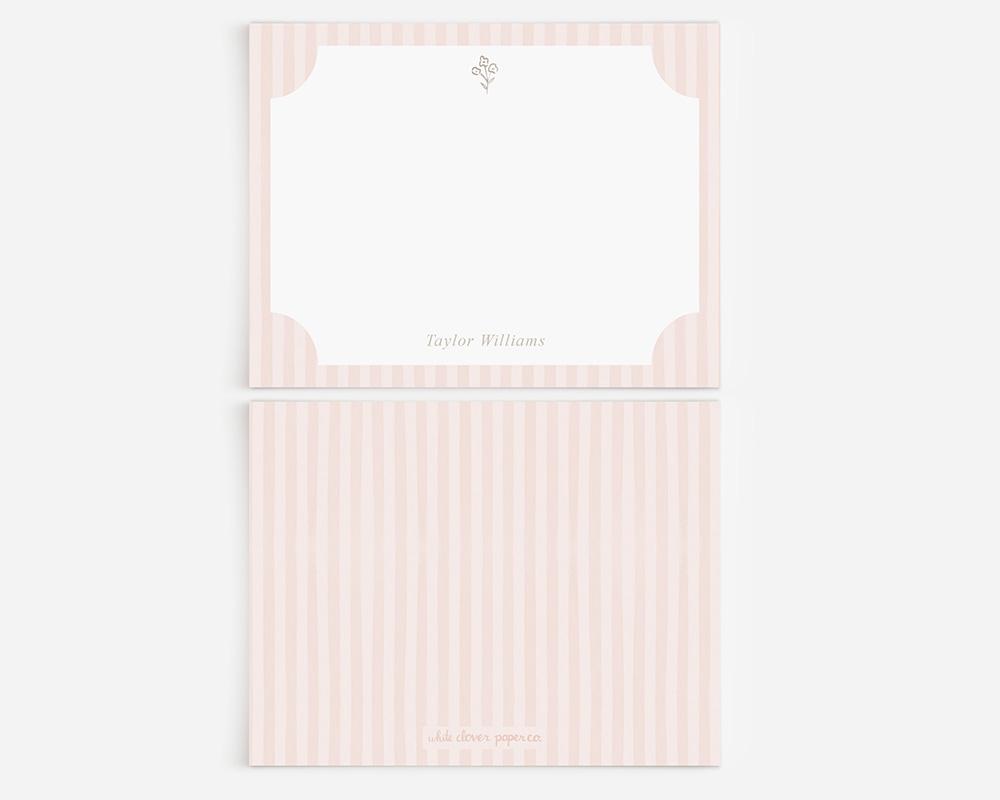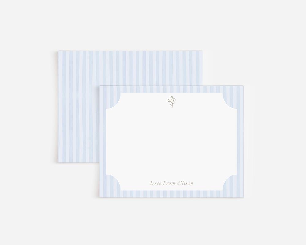 A sweet and elegant stationery set to add a charming touch to notes and letters! The front of each card features a striped border behind a rectangular writing space with notched corners. A tiny taupe flower cluster adorns the top of each card with your personalization at the bottom. The back of each card features a watercolor striped pattern.