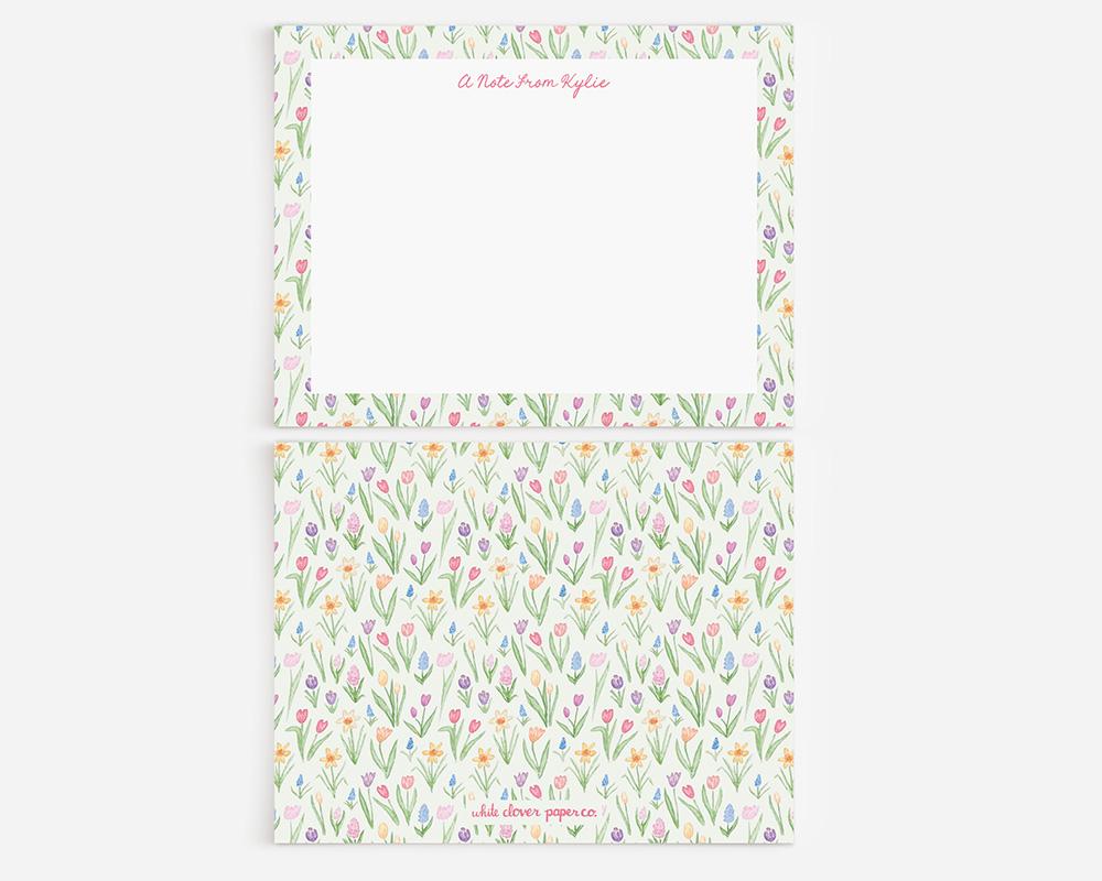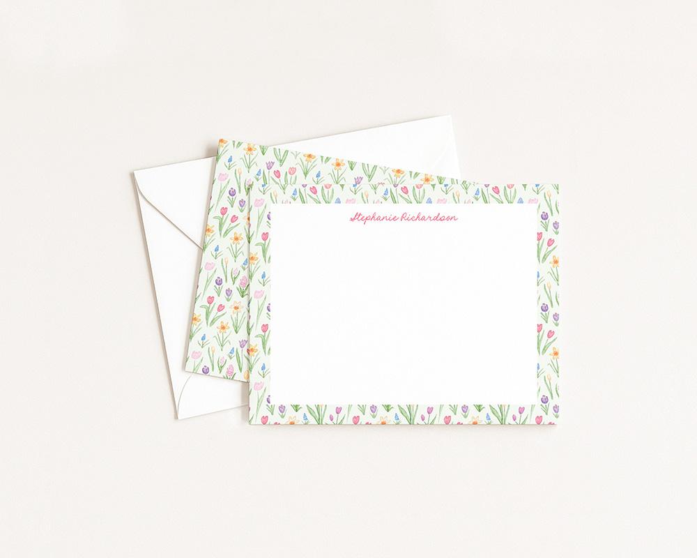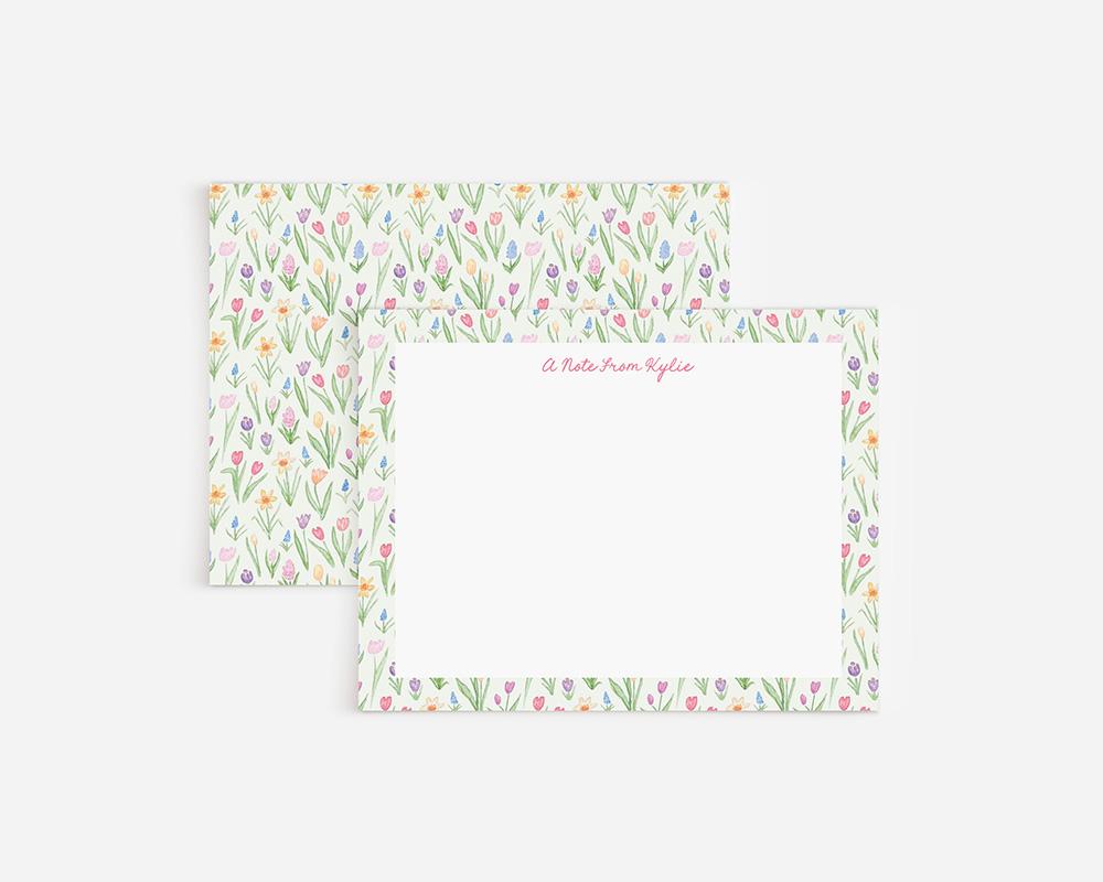 A bright and cheerful stationery set that’s perfect for Spring! The front of each card features a border of tiny watercolor flowers in a variety of vibrant colors along with your personalization in a fun pink script font. The back of each card features a pattern of spring bulb flowers including crocuses, tulips, daffodils, and hyacinths on a pale green background.