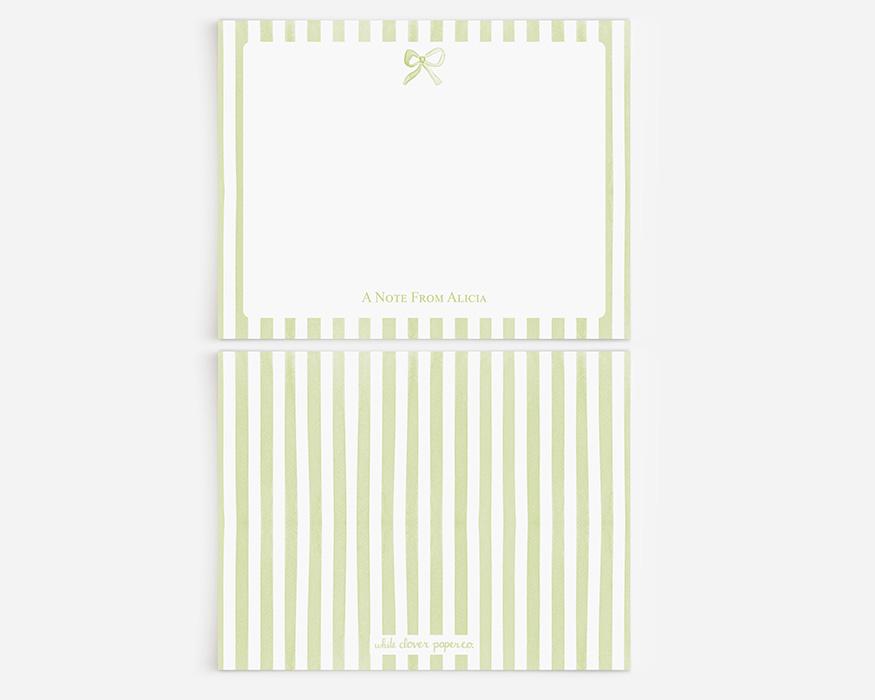 These darling note cards are sure to add some personality to your notes and letters! The front of each card features a border of watercolor stripes. A tiny watercolor bow adorns the top of each card, while the bottom features your personalized message. The back of each card has a pattern of watercolor stripes. Available in your choice of vibrant colors.