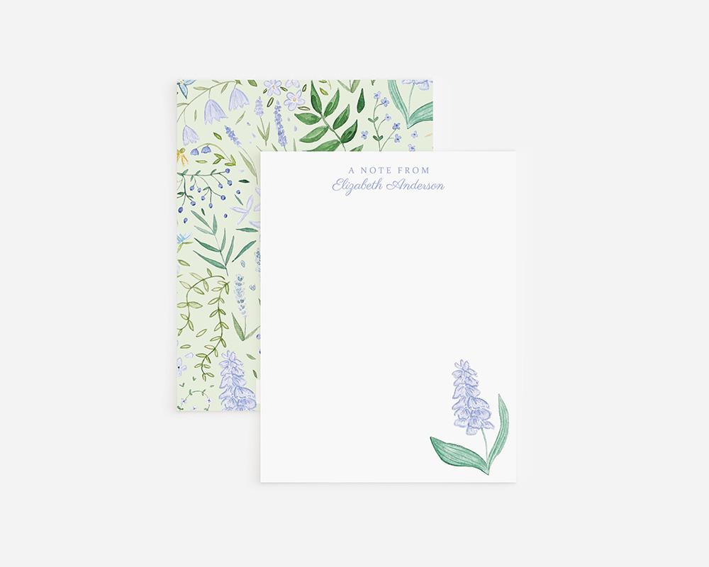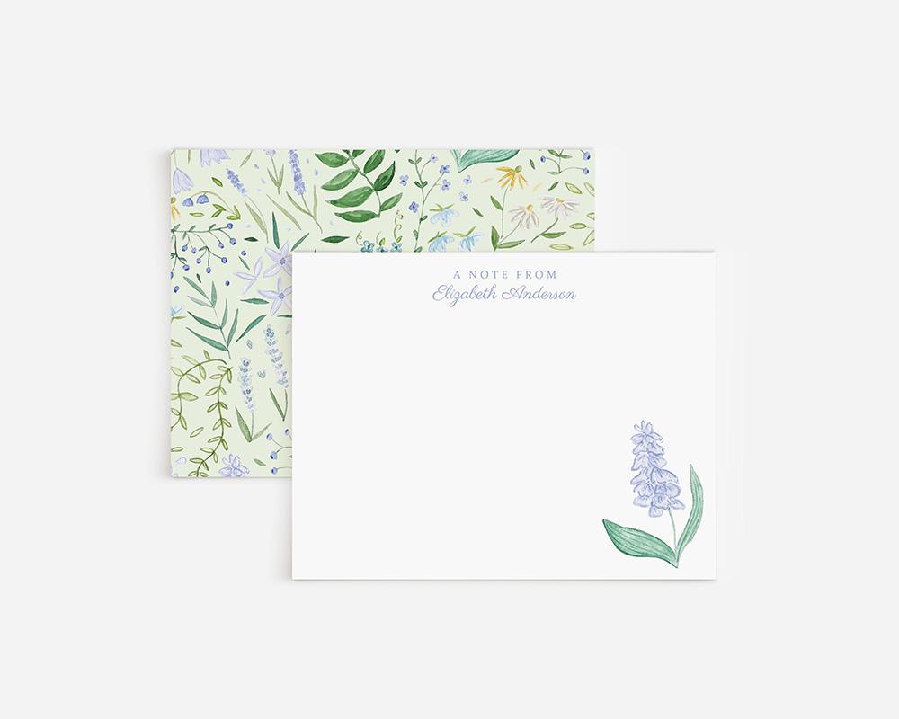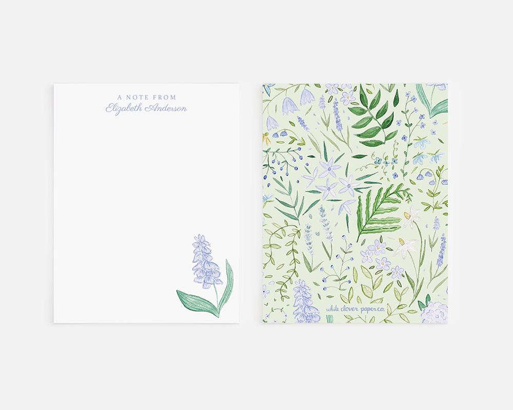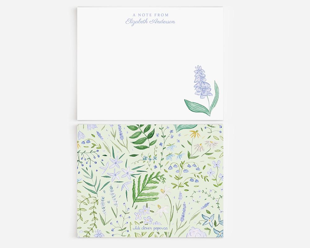 A sweet, springy stationery set with a charming floral design. The front of each card features your personalization at the top and a blue watercolor flower in the lower right corner. The back of each card features an assortment of tiny blue and green watercolor flowers and leaves on a pale green background.