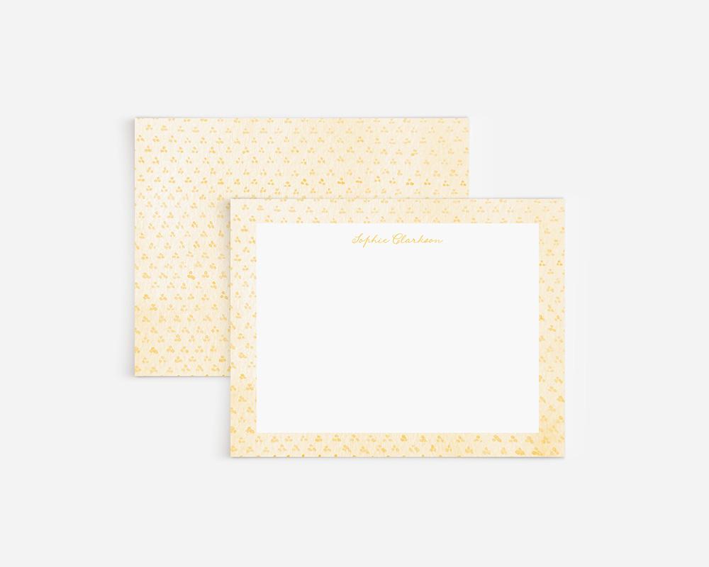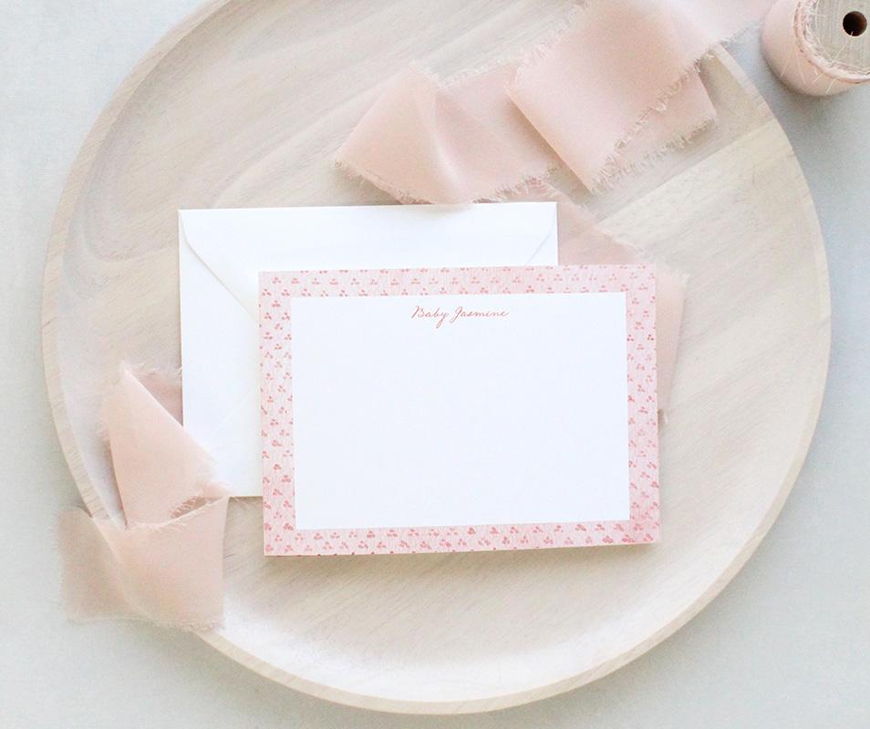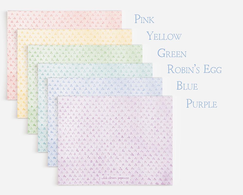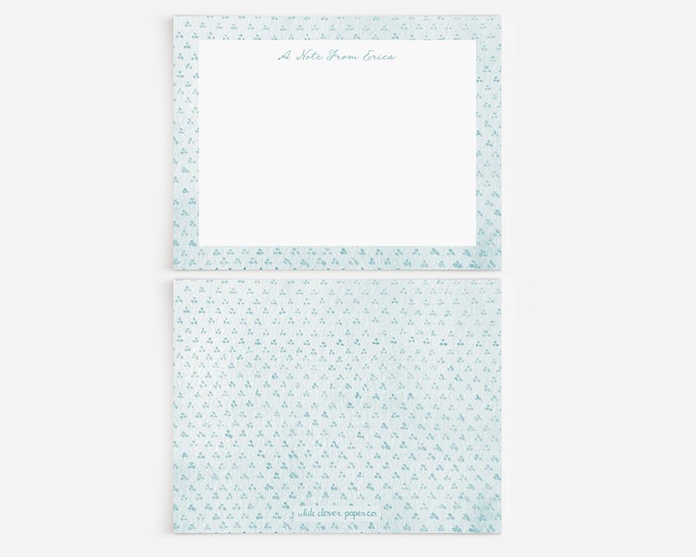 A sweet and charming stationery set that’s perfect for any occasion! The front of each card has a border of tiny watercolor dots on a solid watercolor background and your personalization in a charming script font. The back of each card has a pattern of tiny trios of dots on a watercolor background. Available in a variety of springy pastel colors.