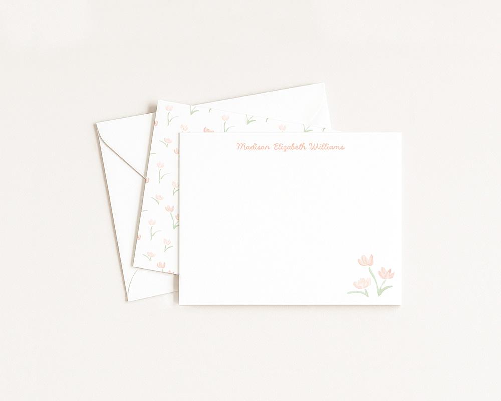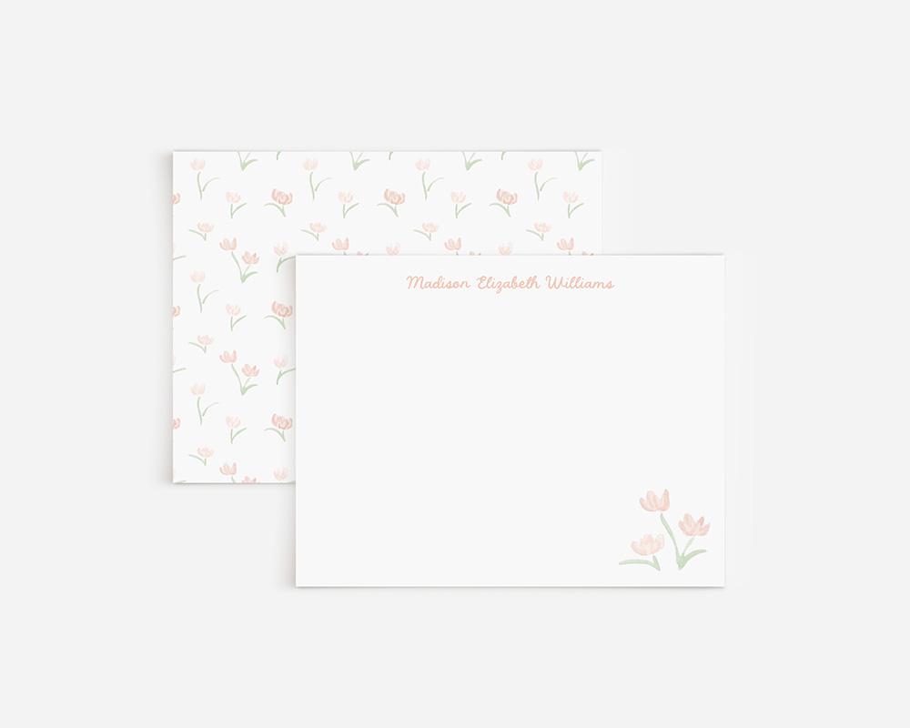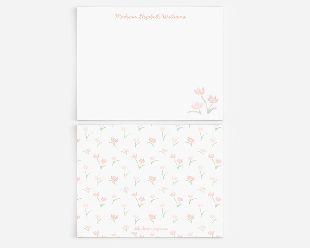 A charming stationery set with sweet peach florals. The front of each card features your personalization at the top in a charming script font and a cluster of peach watercolor flowers in the lower right corner. The back of each card features a pattern of tiny peach flowers.