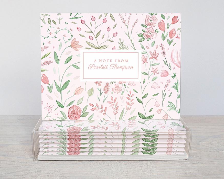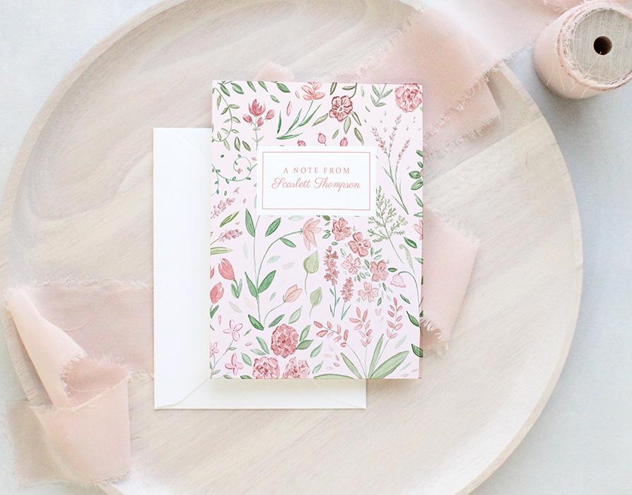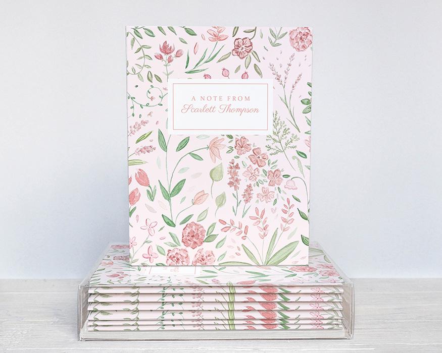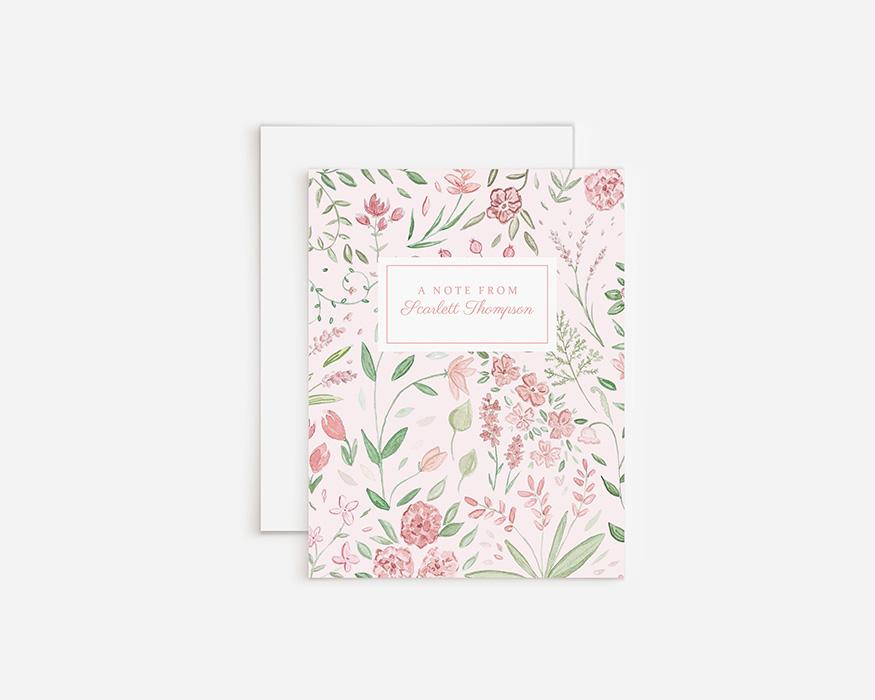 Add a personal touch to your greeting cards with these sweet floral cards. Cards read “a note from” with your name on the front with a background of tiny pink watercolor flowers. Makes a great gift for a wide variety of occasions!