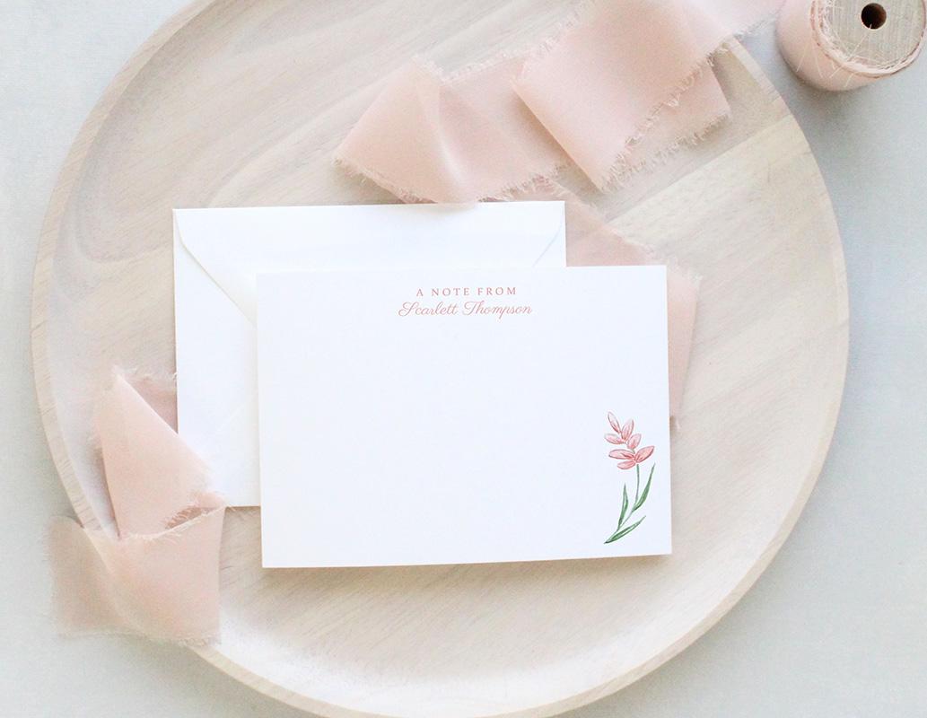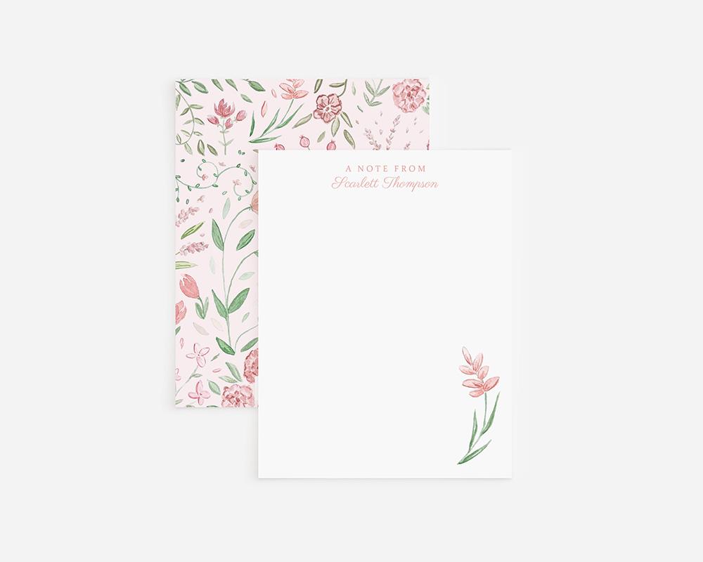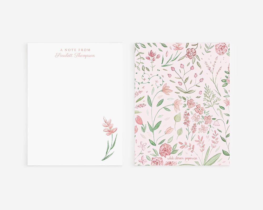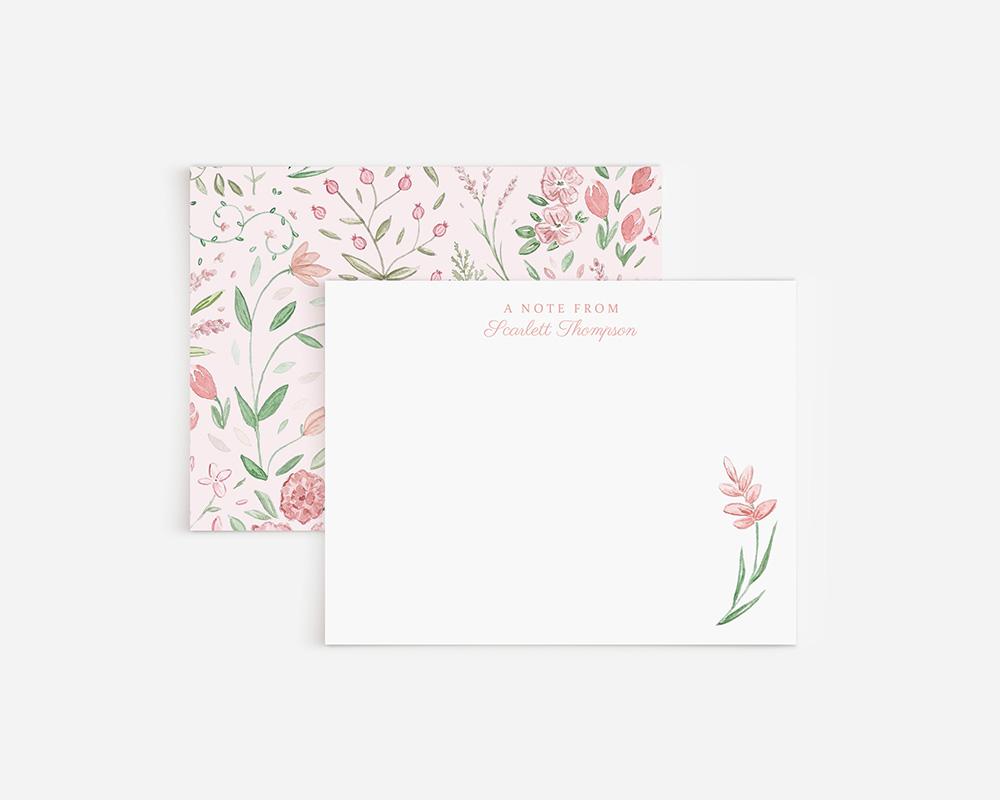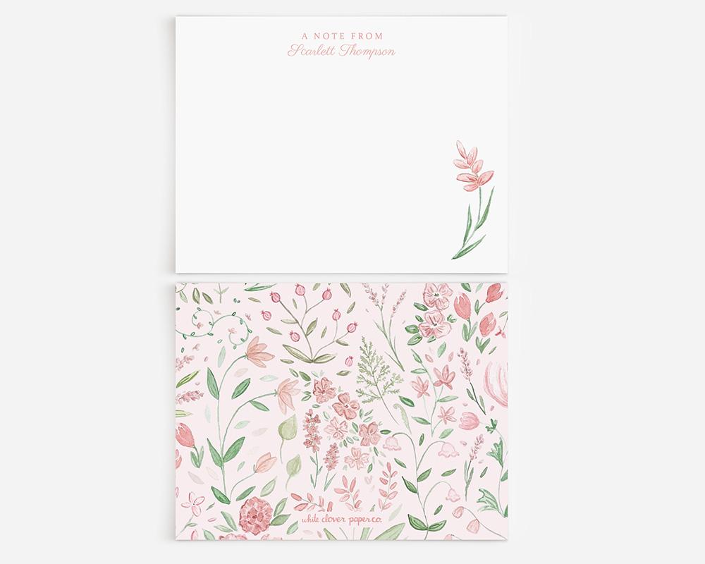 A sweet, springy stationery set with a charming floral design. The front of each card features your personalization at the top and a pink watercolor flower in the lower right corner. The back of each card features an assortment of tiny pink watercolor flowers and leaves on a pale pink background.