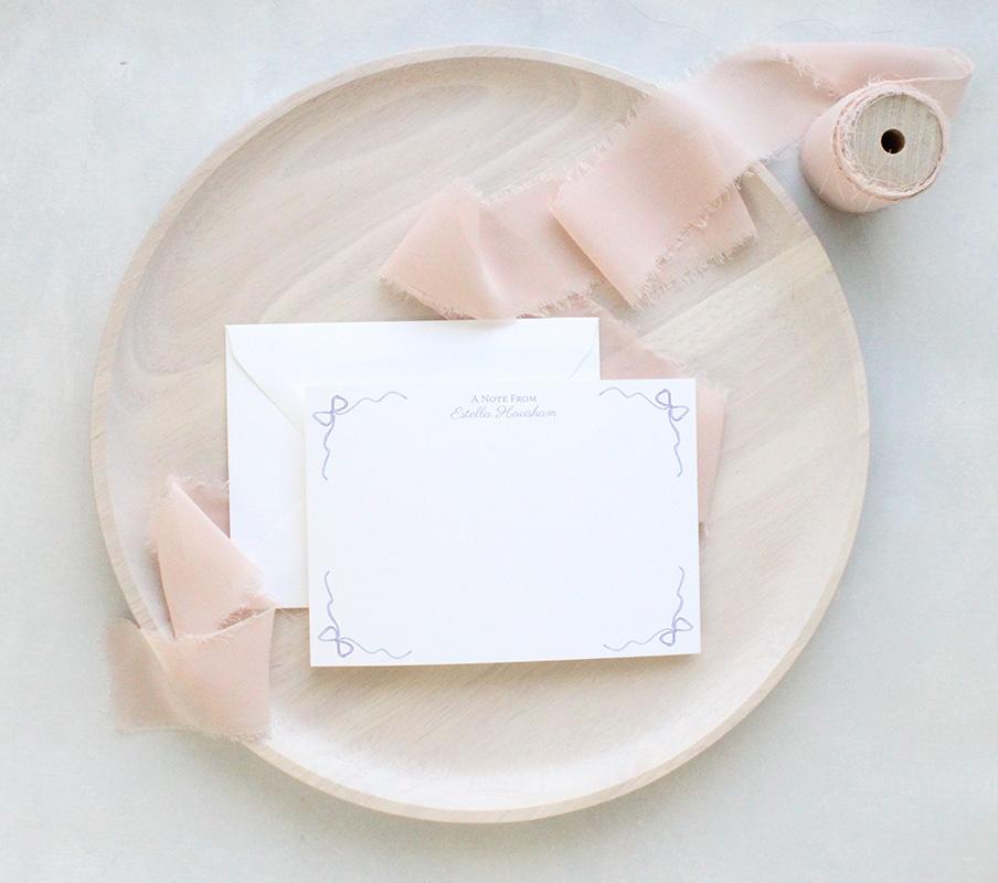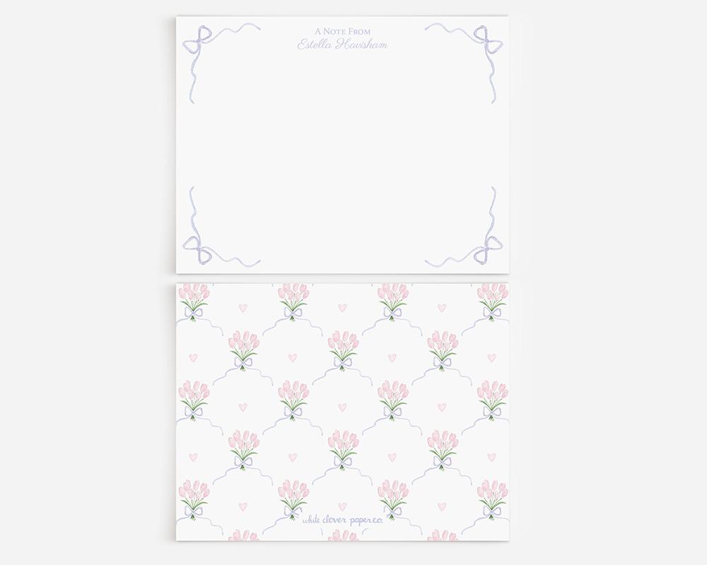These darling stationery cards are sure to charm and delight! The front of each card features your personalization at the top and tiny periwinkle bows in the corners to create a border. The back of each card features a pattern of light pink watercolor bouquets of tulips, periwinkle bows, and tiny pink hearts.