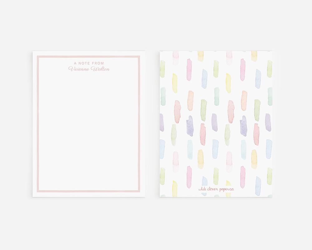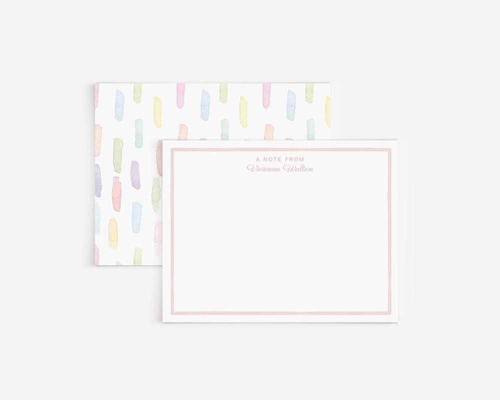A fun and colorful stationery set for the creative in your life! These personalized note cards feature a thin pink border on the front along with your personalization. The back of each card has a pattern of watercolor brushstrokes in a variety of joyful pastel colors.