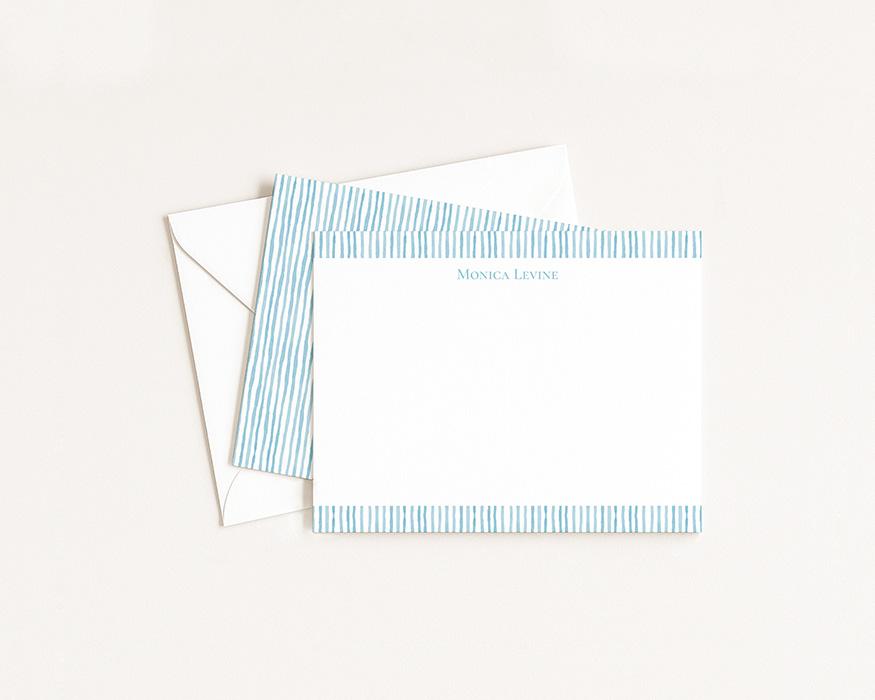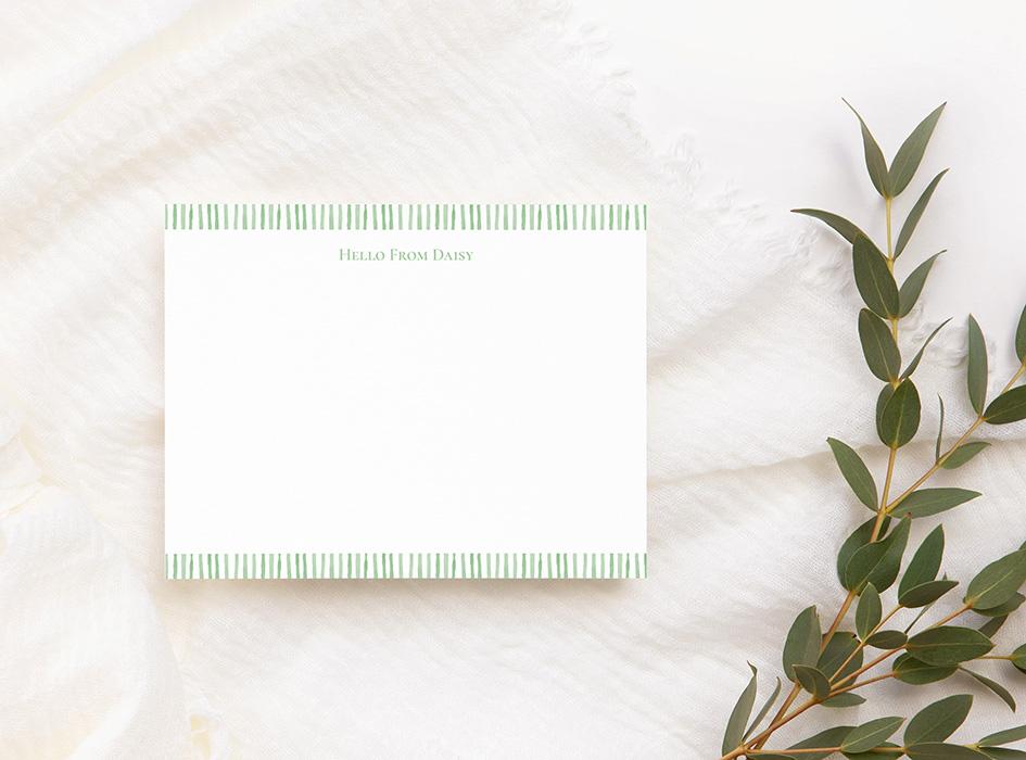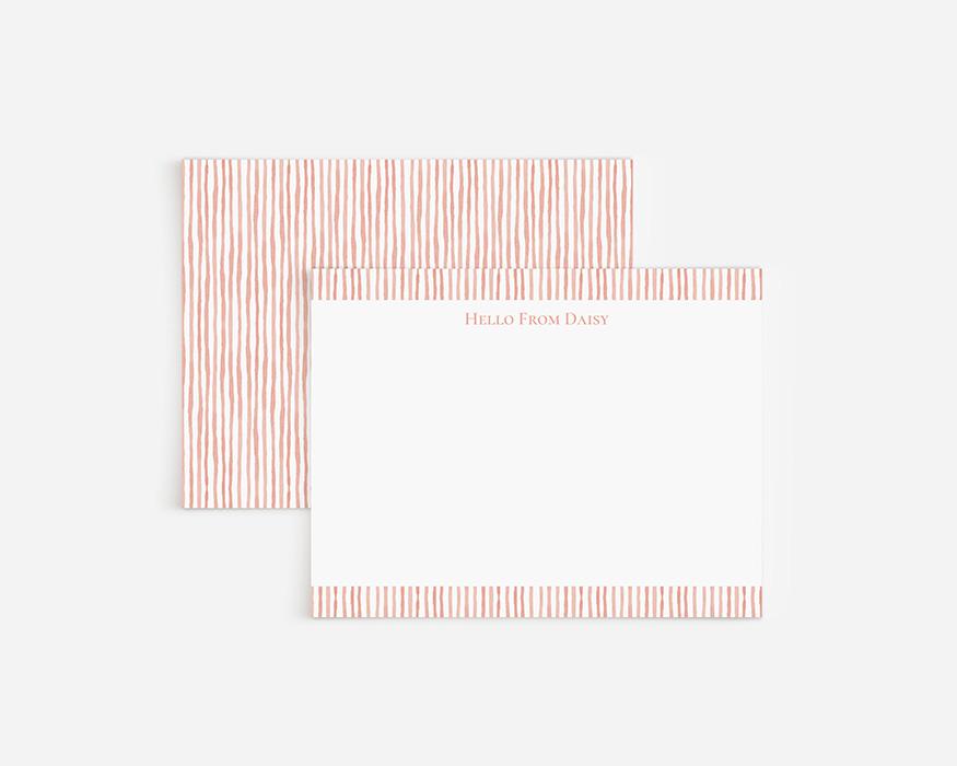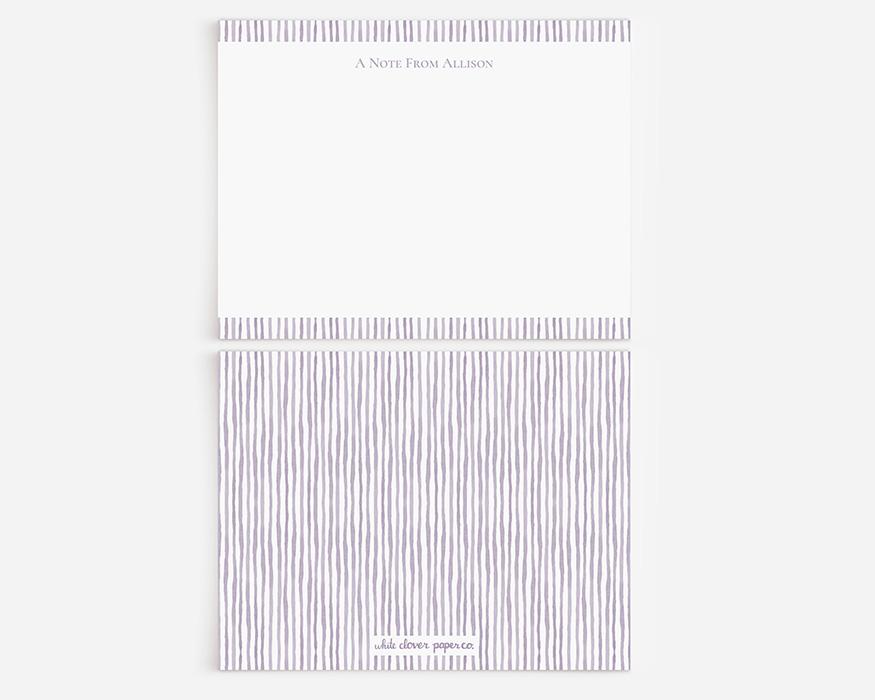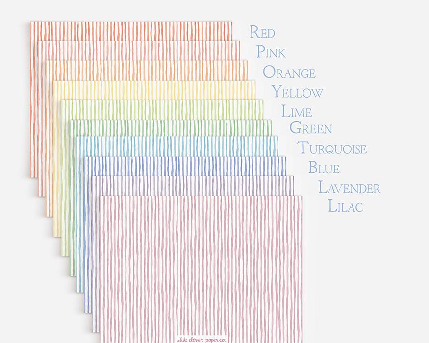 Add some excitement to your notes with a fun pop of color! These fun and charming note cards feature a pattern of thin watercolor stripes on the back, with a border of stripes along the top and bottom on the front. Available in a variety of vibrant colors and personalized at the top with your name.