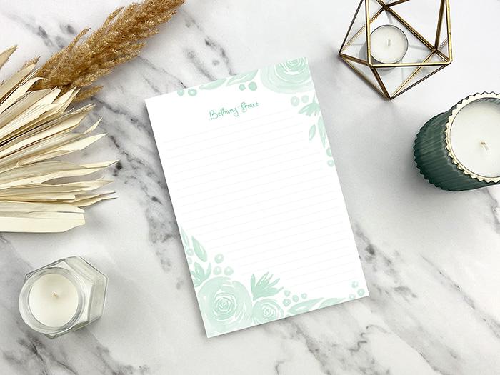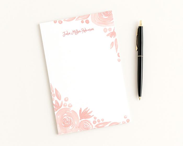 Add a pretty touch to notes and to do lists with this floral watercolor notepad! This notepad features watercolor roses and your personalization in a fun script font at the top. Available in peachy pink, dusty blue, minty green, and dusty purple, and available with or without lines.
