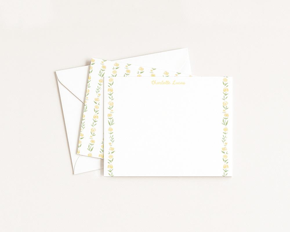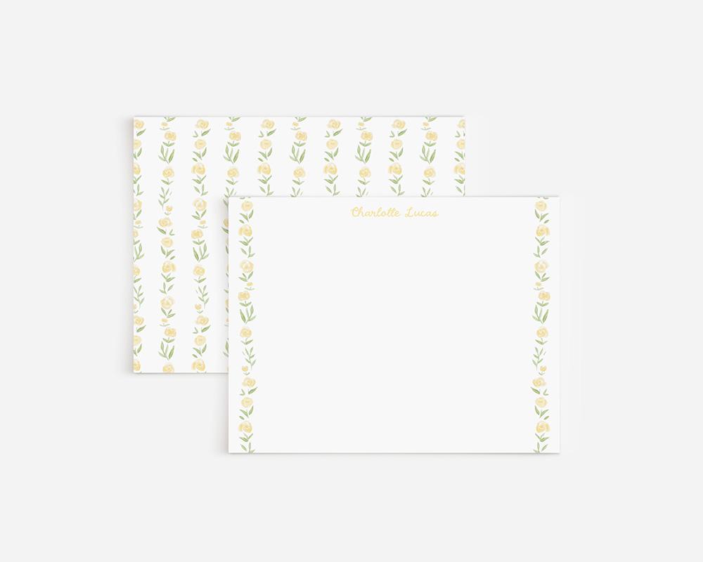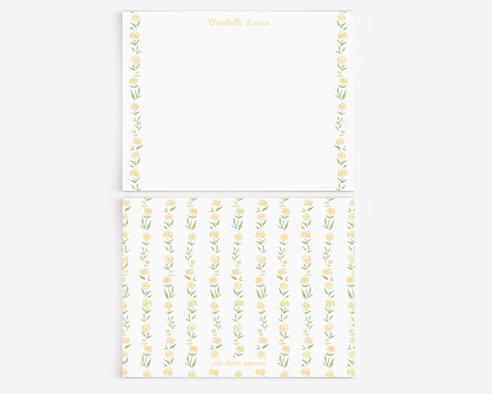 A charming stationery set with sweet yellow florals. The front of each card features your personalization at the top in a charming script font and a border of yellow watercolor roses along either side. The back of each card features a pattern of stripes made up of tiny yellow watercolor roses.